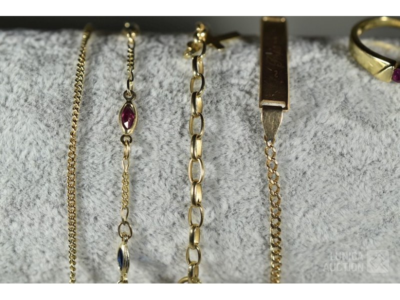 Partij "sloopgoud".Diverse defecte armbanden en ring. Gemerkt met 585 of 14K. Totaal gewicht ca. 10 gram.