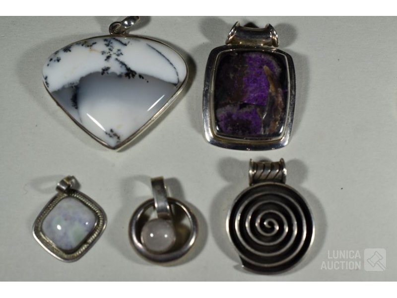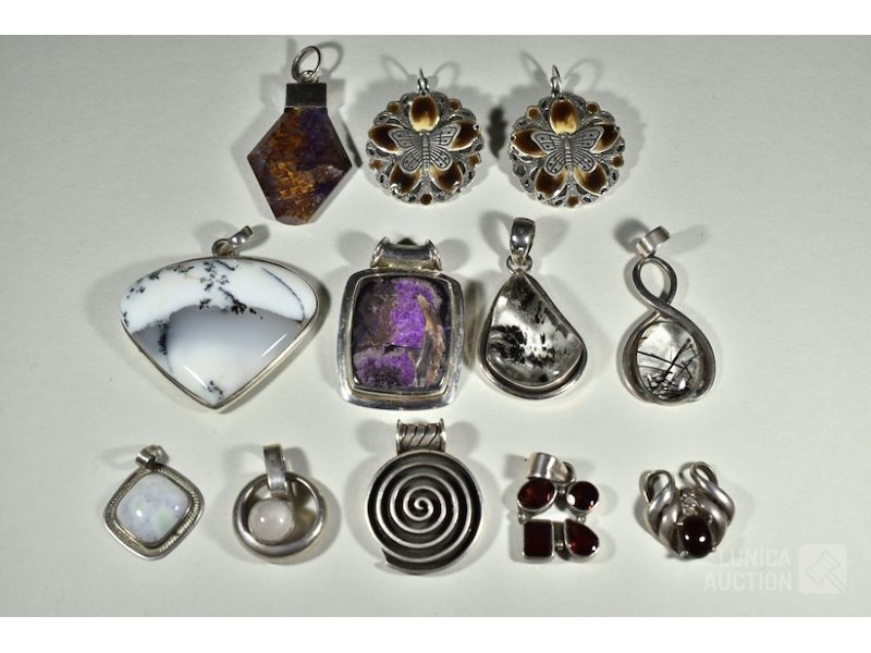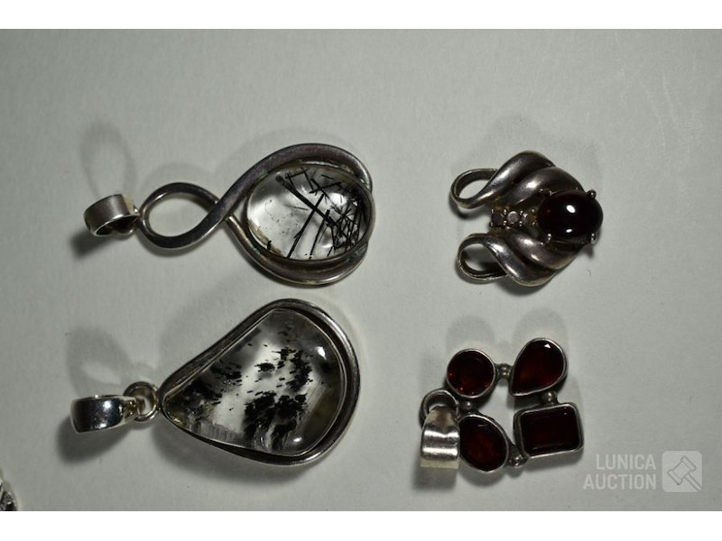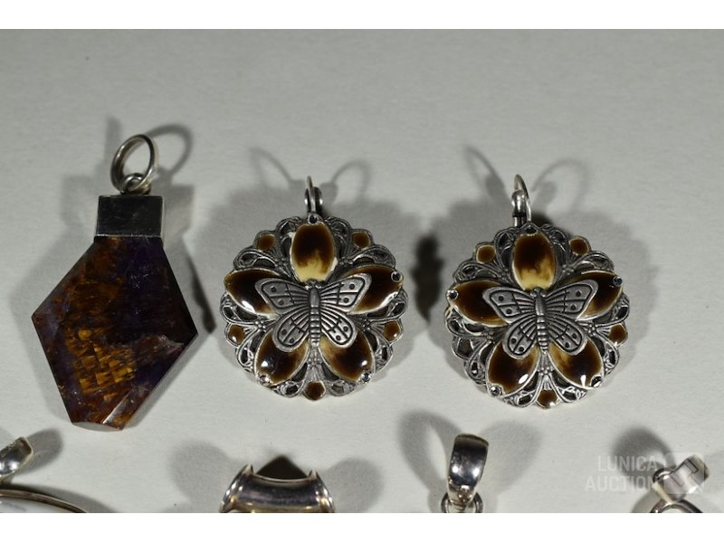 Ca. 10 stuksDeels in zilveren vatting 925. Diverse modellen en materialen. Afmetingen variëren van 17x17 mm tot 42x48 mm. Inclusief set "vlinder" oorclips.