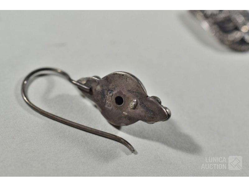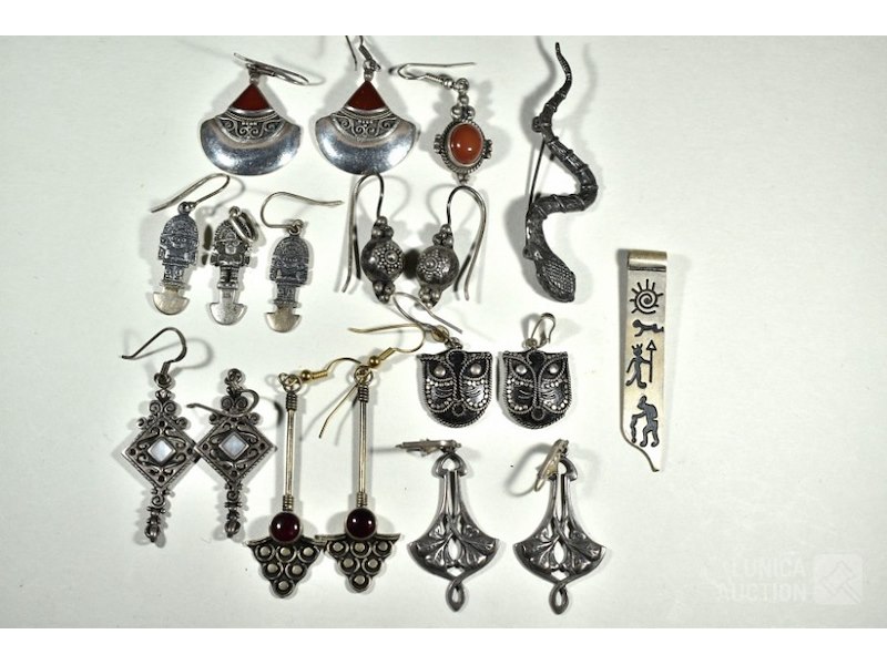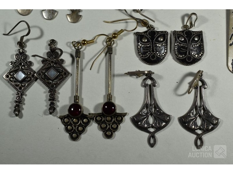 Ca. 7 sets oorhangers, o.a. zilver 925Diverse modellen en afmetingen, van 9x21 mm tot 18x45 mm. De meeste gemerkt met 925. Inclusief 3 hangers en "slangen"broche. Totaal gewicht ca. 50 gram.