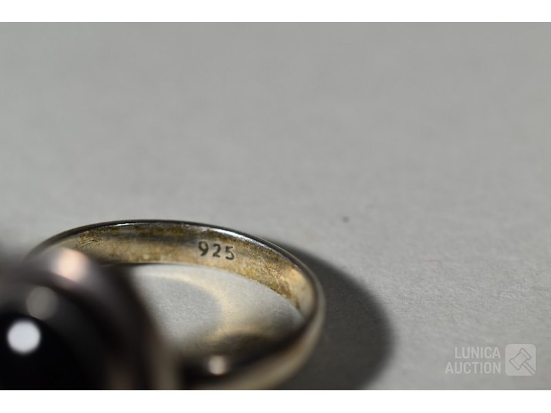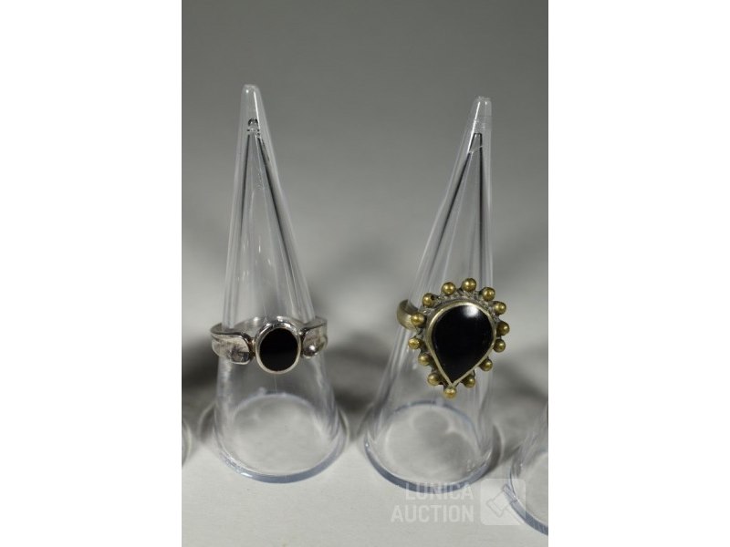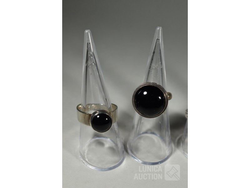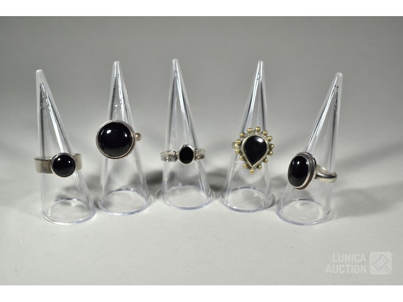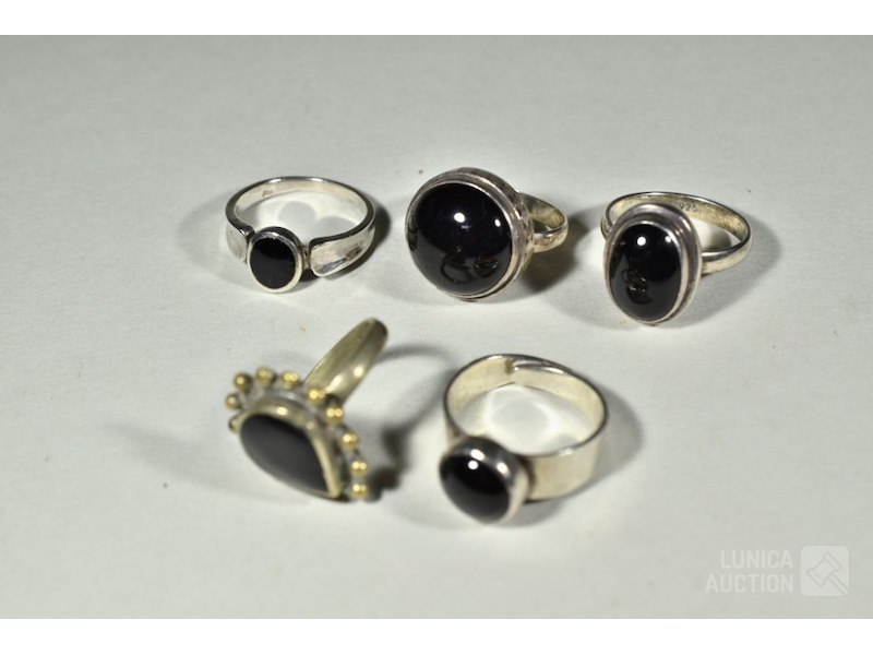 5 stuksGemerkt 4x 925, 1x niet gemerkt. met inzet van o.a. onyx. Ringmaat 17 mm, 18 mm, 18,5 mm en 19 mm. Totaal gewicht ca. 23 gram.