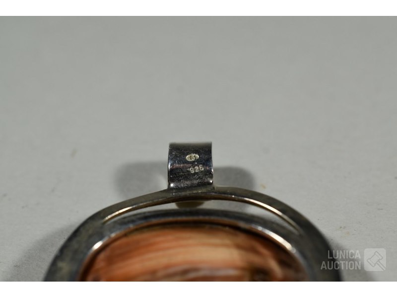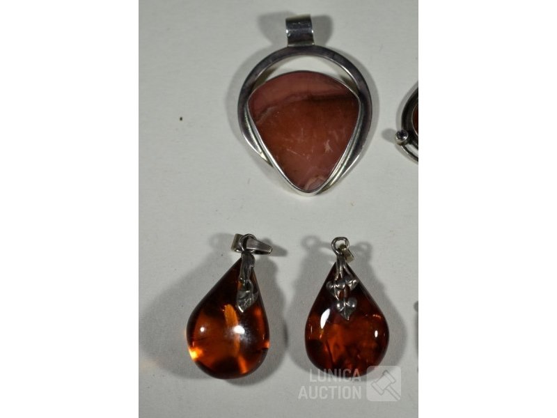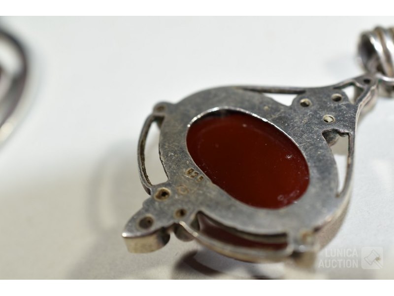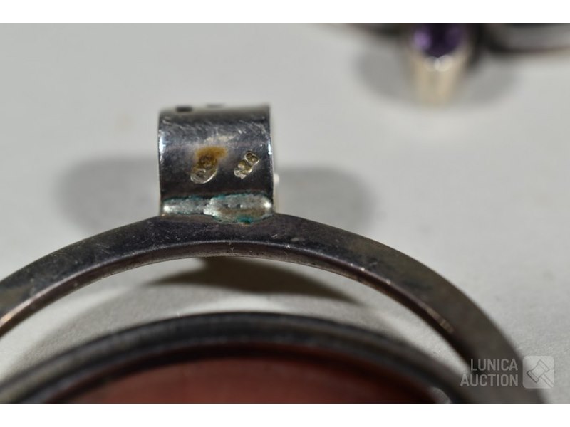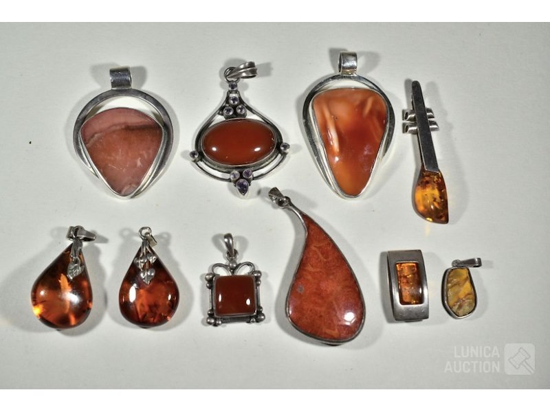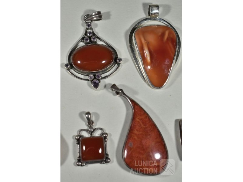 Ca. 10 stuksIn zilveren vatting, deels gemerkt 925. Diverse modellen en materialen, o.a. barnsteen, koraalsteen en carneool. Afmetingen variëren van 12x18 mm tot 27x50 mm. Totaal gewicht ca. 98 gram.
