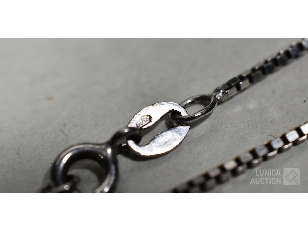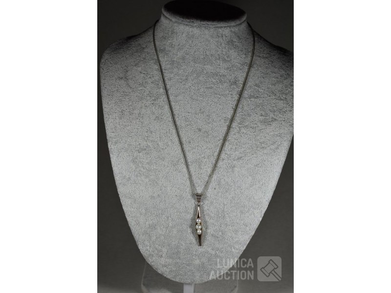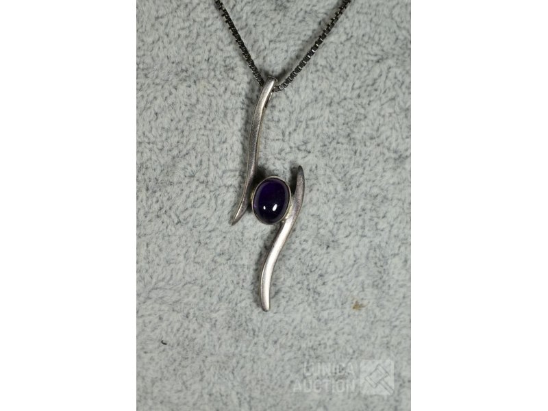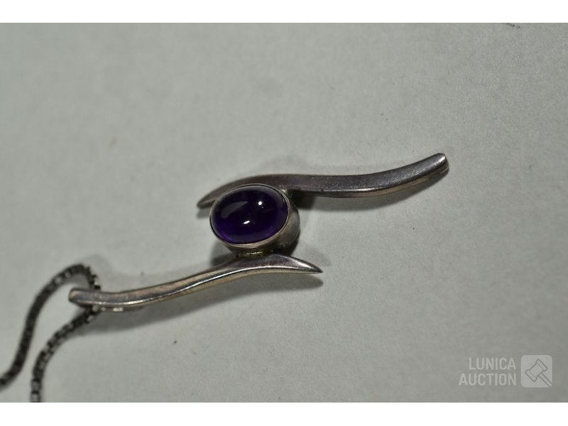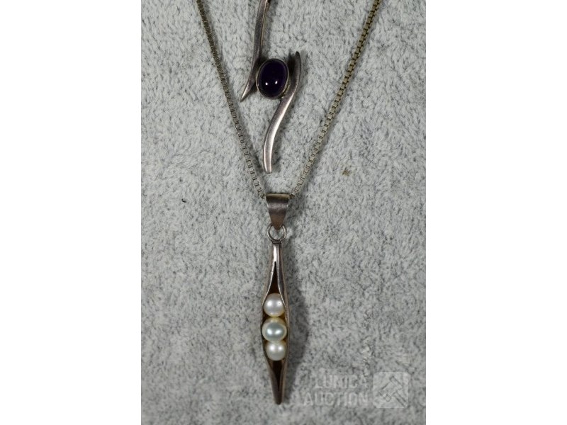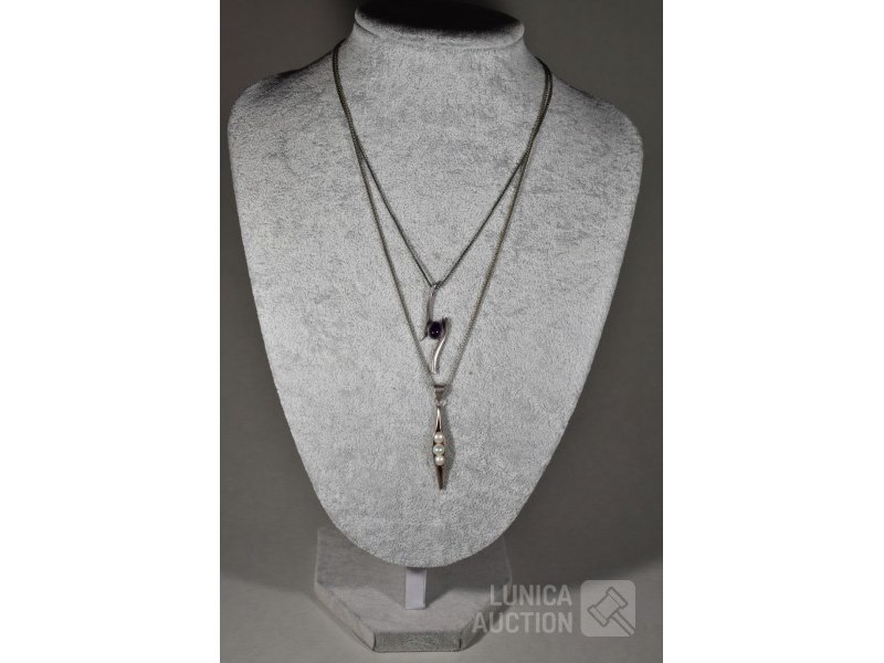 2 stuksHalskettingen, gemerkt 925. lengte 40 cm en 48 cm; Hangers, niet gemerkt, laag gehalte zilver, met inzet van pareltjes en amethist Totaal gewicht 12,8 gram.