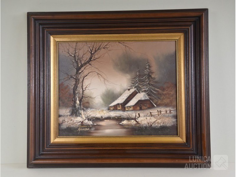 Olieverf op doek, "huis in sneeuwlandschap"Gesigneerd L.O. met "Bruinsma", ingelijst, afmeting 74x64 cm.