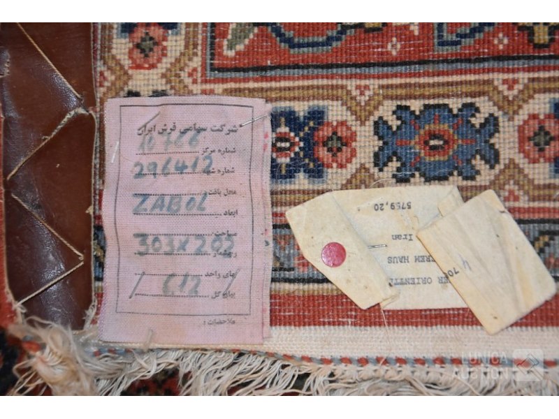 "Zabol Iran", in goede staatAfmeting 303x202 cm Oorspronkelijke adviesprijs op het etiket € 5759,-- Op de lange zijde is aan de achterkant de rand voorzien van een lederen afwerking."vlekken" op foto is shading ("schijnvlekken")