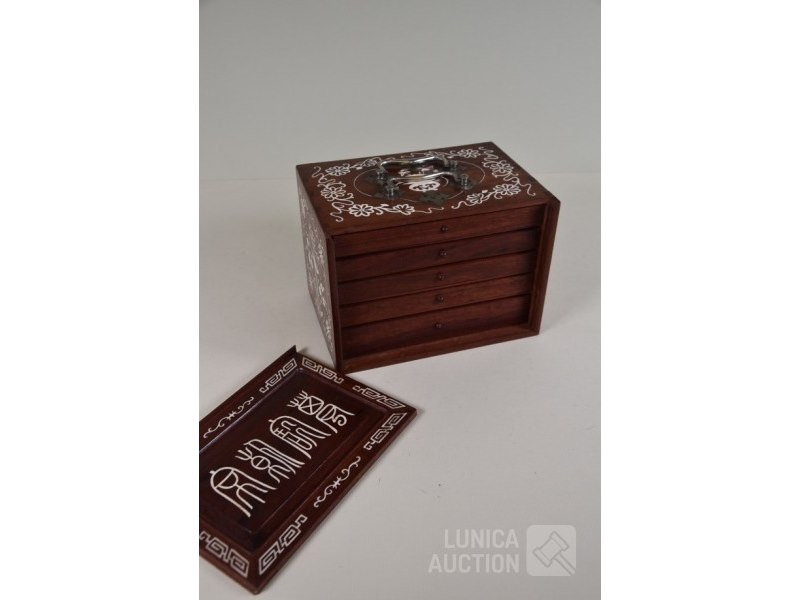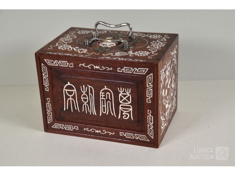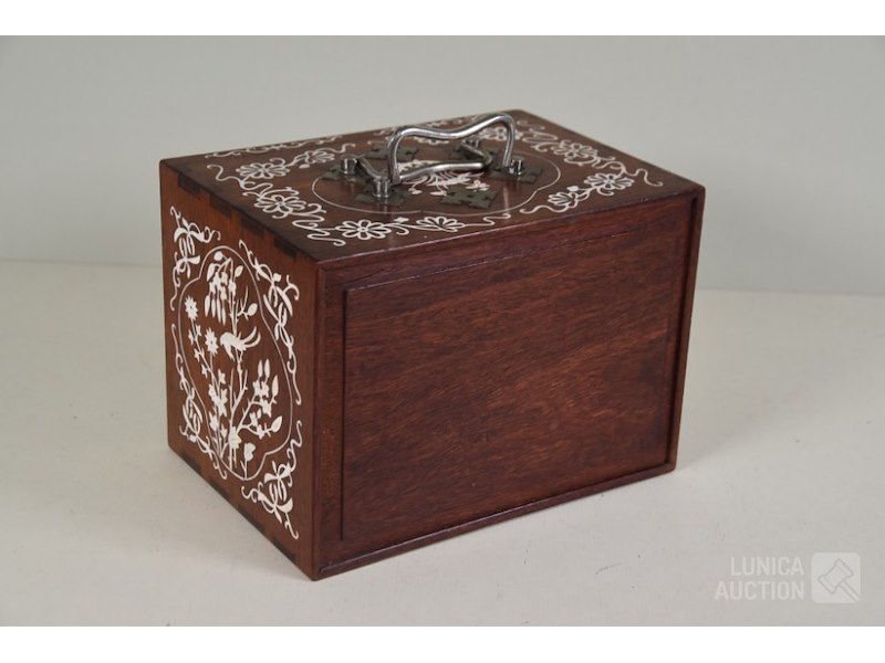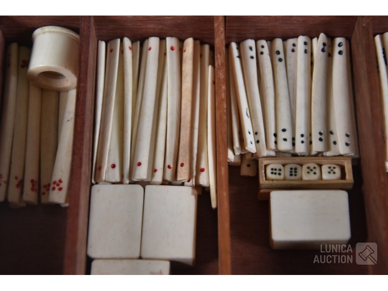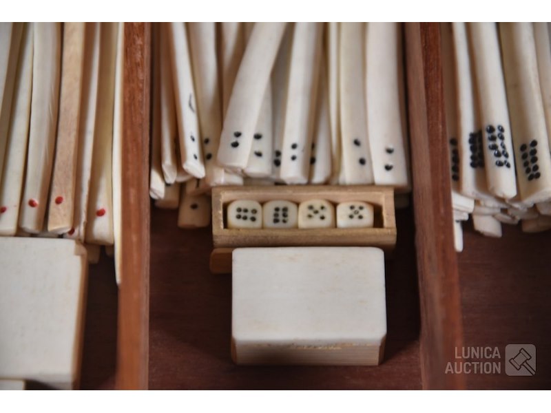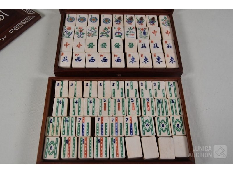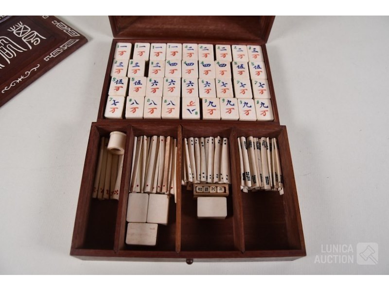In mooie rijkelijk versierde kistMet 144 stenen en toebehoren, inclusief Nederlandse gebruiksaanwijzing met op de achterzijde de tekst "Mah-jongg spelen geleverd door WJ Hessels Hang 94 Rotterdam , telefoonnummer 1956" ( uit de jaren'50) Stenen zijn gemaakt van been en bamboe. Kist is ingelegd met been en rijkelijk versierd. Afmeting 23x16x17 cm. Mooie set!