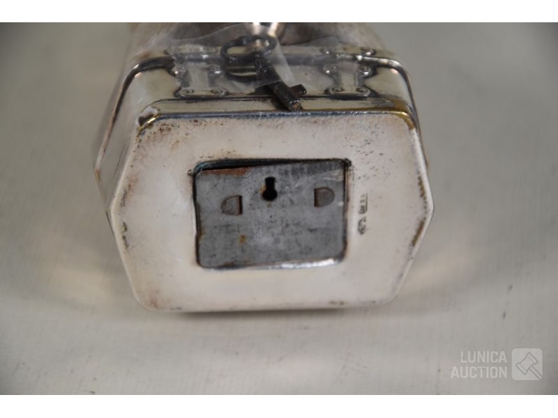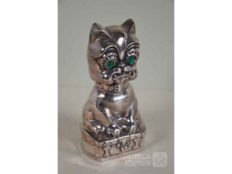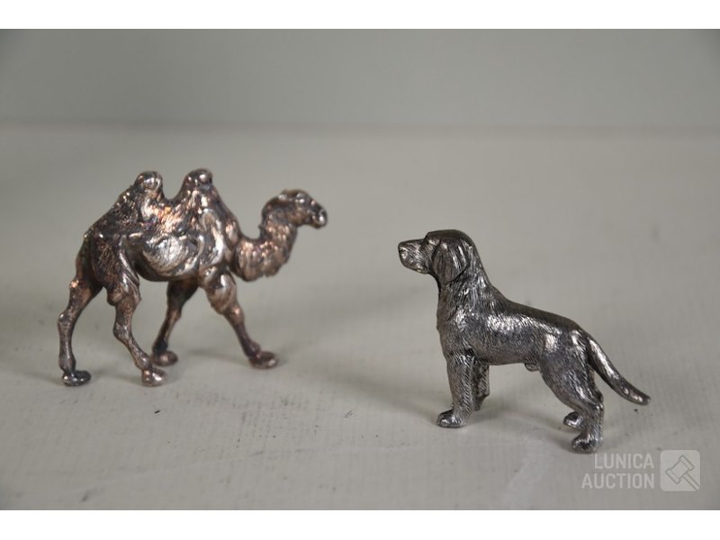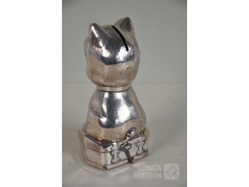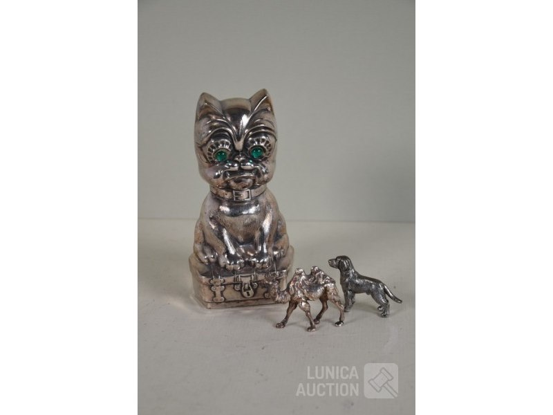 2 stuksSpaarpot in de vorm van kat, met sleutel, ontwerp J.T. Steffensen Denemarken. Hoogte 15 cm; Miniatuur kameel, hoogte 4,5 cm, lengte 6,5 cm.; Miniatuur hond, niet verzilverd, hoogte 4 cm, lengte 5 cm.