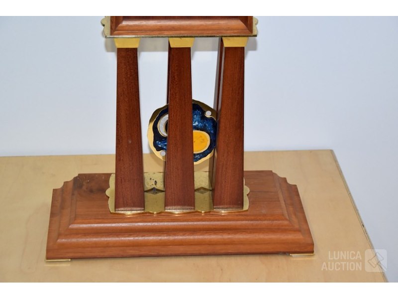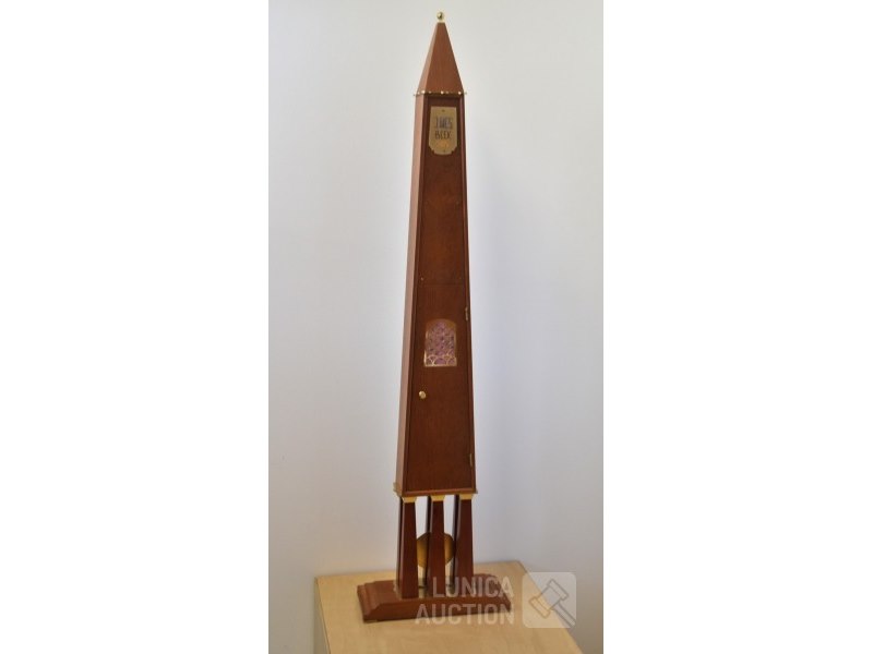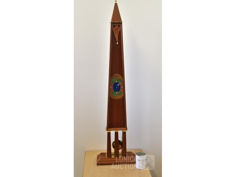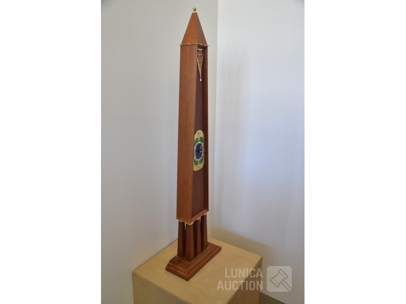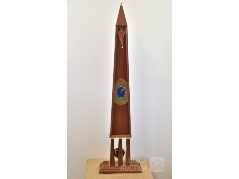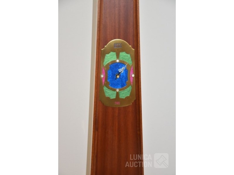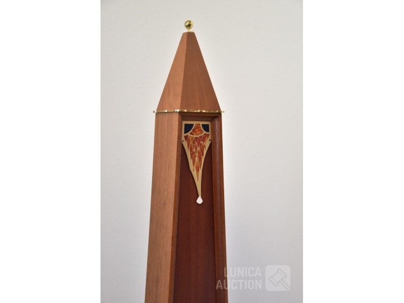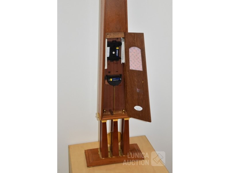 2005Gebruikte materialen: Klok kast: palissander/teakhout, en messing Messing naamplaat. Uurwerk, radiografisch. Slinger werkt op batterij. Afmeting (bxdxh) 32x14x123 cm.! Werkuren 390 uur. Johan Paes, Beek (1938-2022) Johan Paes, Beek (1938-2022). Een kunstzinnige timmerman. Beekenaar Johan Paes, timmerman van beroep, had als “hobby” het ververvaardigen van meubelen en heel bijzondere klokken. Zijn superieure vakmanschap is terug te zien in het aanbod van de kunstige en minutieus gemaakte voorwerpen in hout. Zijn inspiratie haalde hij uit de Art Deco stijl en in zijn klokken herken je de architectuur van de beroemde hoge gebouwen in New York.