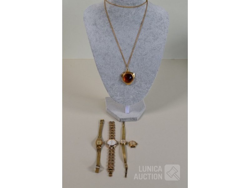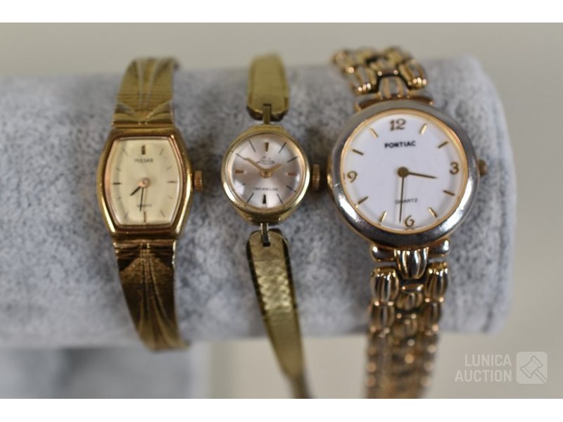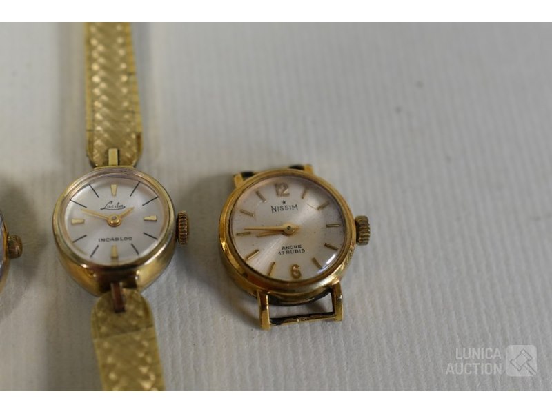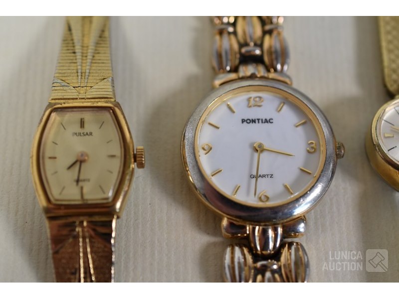 Ca. 6 stuksO.a. Dameshorloge PONTIAC Quartz; Dameshorloge LASITA Incabloc; Dameshorloge PULSAR Quartz V810-5140; Dameshorloge NISSIM Ancre 17 rubis, zonder horlogeband. ZARIA (made in USSR) 21 jewels kettinghorloge, gemerkt met AU5; losse goudkleurig ketting. De meeste horloges zijn van doublé goud. Horloges zijn niet getest.