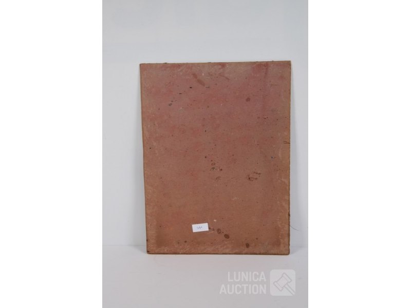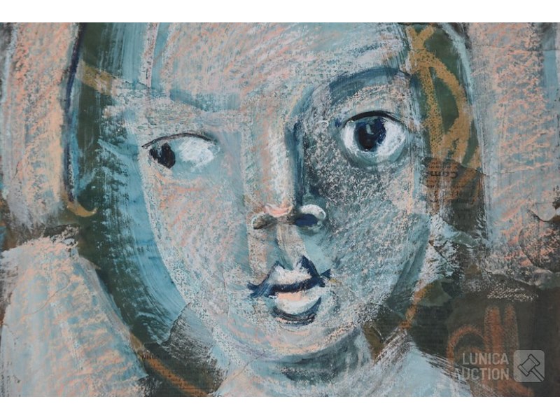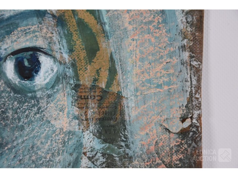 "hoofd"Mix media op schilderskarton, afmeting 30x45 cm. Het betreft '"krantenpapier"geplakt op karton waarover tekening is gemaakt. Kleine stukjes papier zitten los, niet storend. Niet gesigneerd.