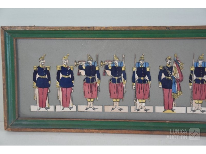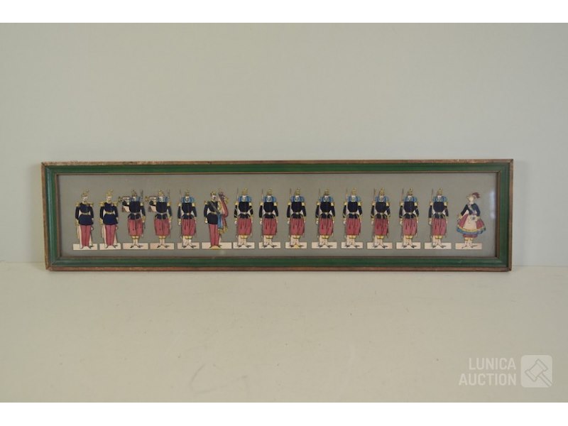 15 papieren zouaven in een kader19e eeuws, achter glas, ingekleurde gravures, uitgeknipt/uitgesneden. Afmeting lijst 63x15 cm!.