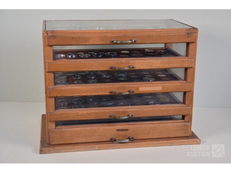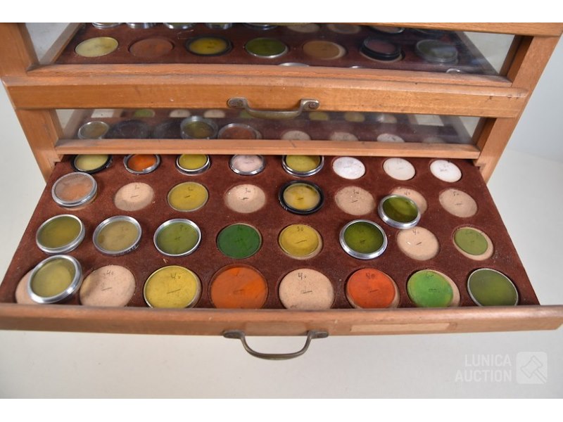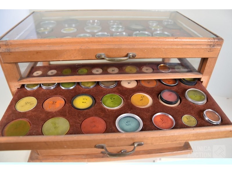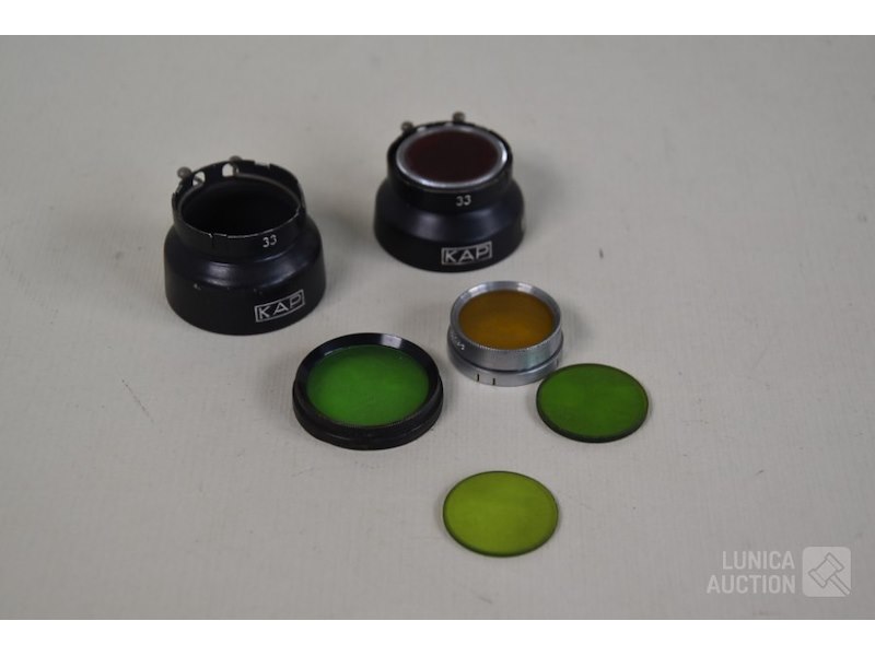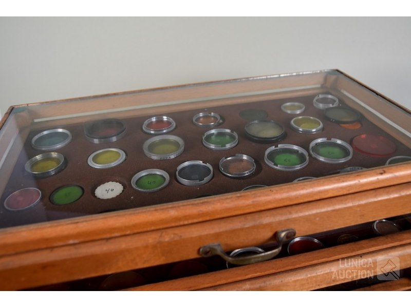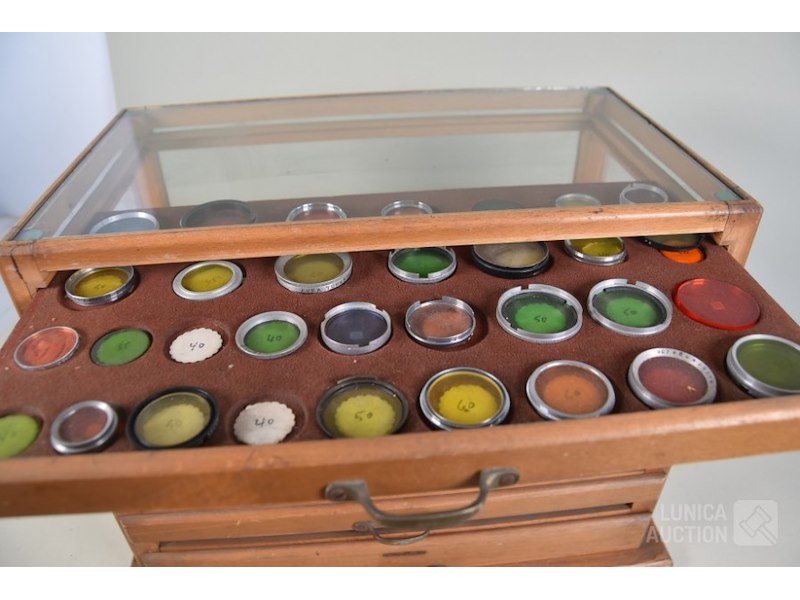 Met inhoud van ca. 135 lens glazen en lenskappenIn diverse kleuren en afmetingen. Lens/zonne kappen van KAP. Gekleurde filters voor fotografie. Afmeting van kabinet met 5 laden, (bxdxh) 44x25x35 cm. Deze kavel wordt niet verzonden met een pakketdienst.