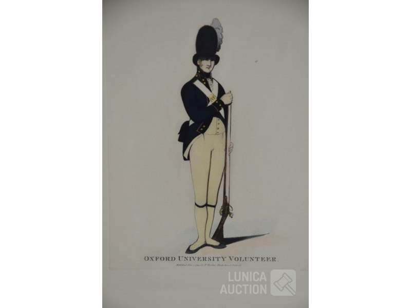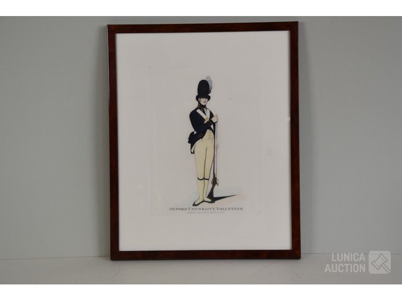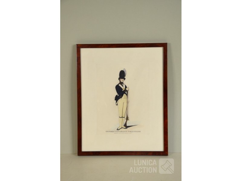 In mooie mahonie houten lijst"Oxford University Volunteer", "Published 1799 by T. Taylor Oxford", Ingelijst, achter glas. Afmeting 35x42 cm.