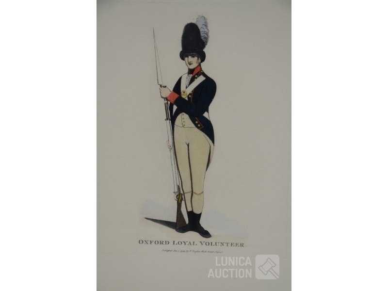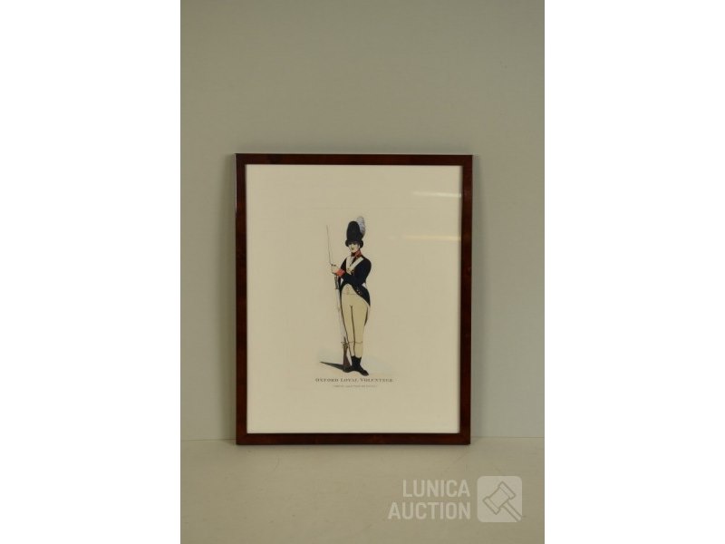 In mooie mahonie houten lijst"Oxford Loyal Volunteer", "Published 1799 by T. Taylor Oxford", Ingelijst, achter glas. Afmeting 35x42 cm.