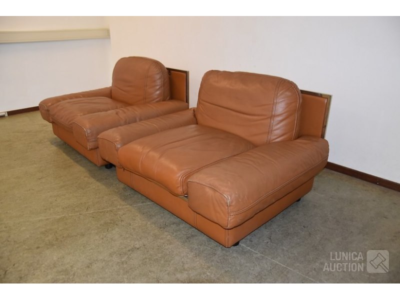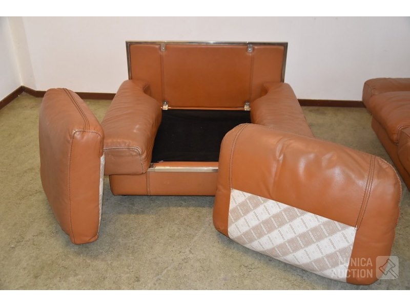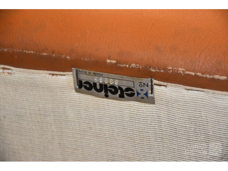 2 stuks, STEINER PARIScognac kleur leder. Lichte gebruikerssporen. Afmeting (bxdxh) ca. 110x90x75 cm. Zithoogte 40/45 cm. Fauteuils zijn genummerd, nummer 89965 en 97295