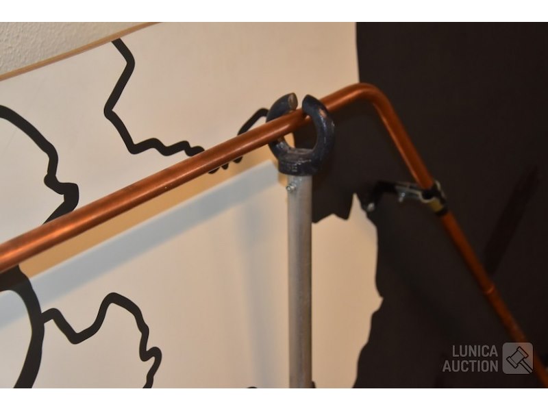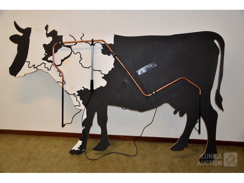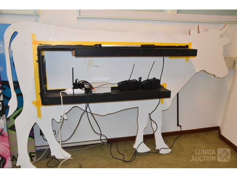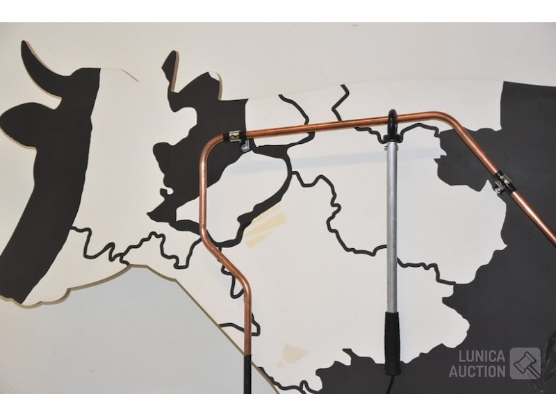 Houten koe, uit TV ProgrammaWerkend, als je het ijzer aanraakt met de staaf gaat de koe loeien. Afmeting (bxdxh) 220x25x130 cm.! Koe, op ware grote, moet worden opgehangen aan achtergrond/wand. Voorkant. Op voorkant zijn taperesten zichtbaar. Uniek exemplaar. Ideaal voor evenementen.