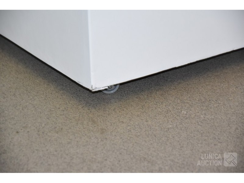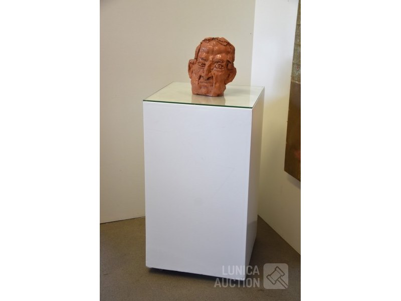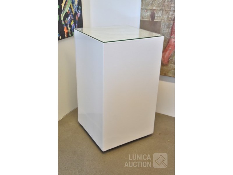 Met losse glasplaatspaanplaat wit geschilderd, op wielen. Afmeting (bxdxh) 50x50x86 cm. Met lichte gebruikerssporen. Beeld op sokkel niet inbegrepen.