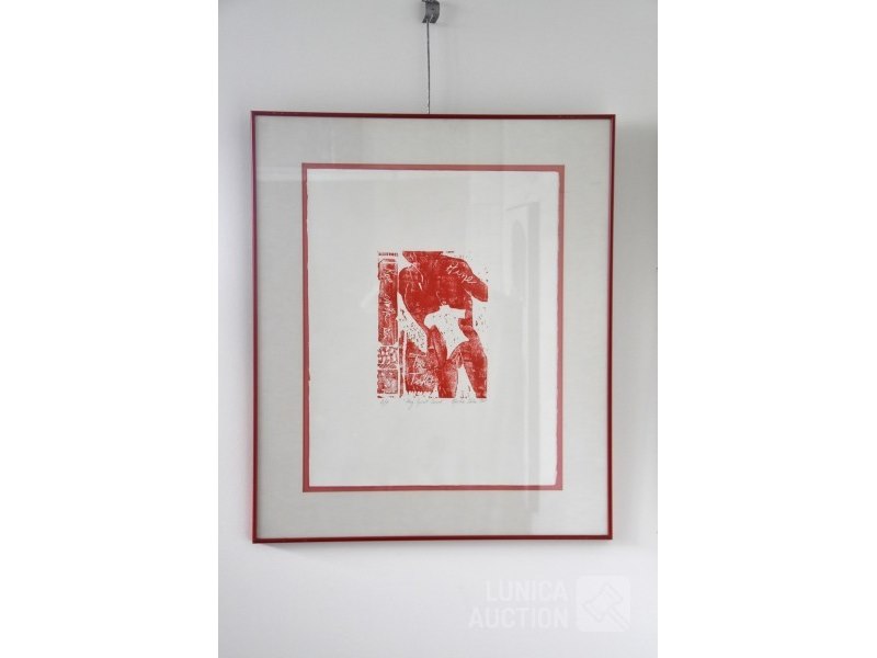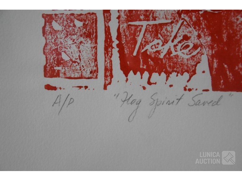 KRISTINE STILES1997, Druk AP, Titel "Taku take rood". Ingelijst, achter glas. Afmeting 75x87 cm. Gesigneerd R.O.