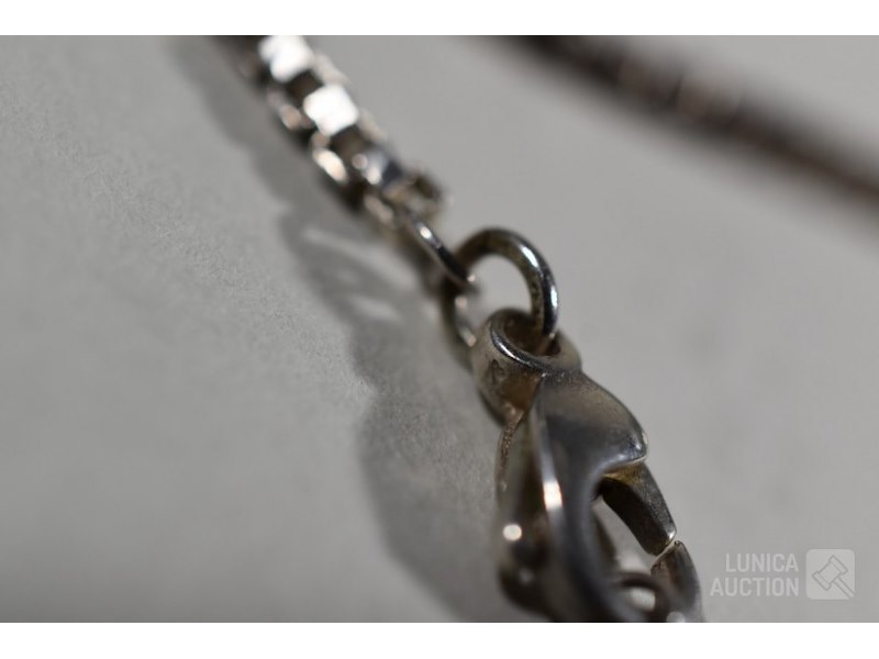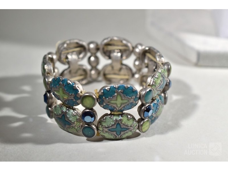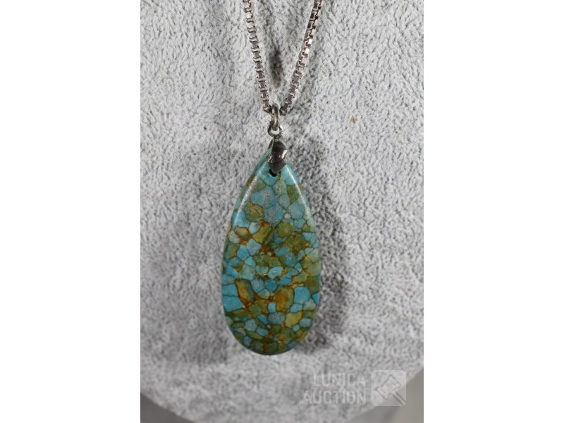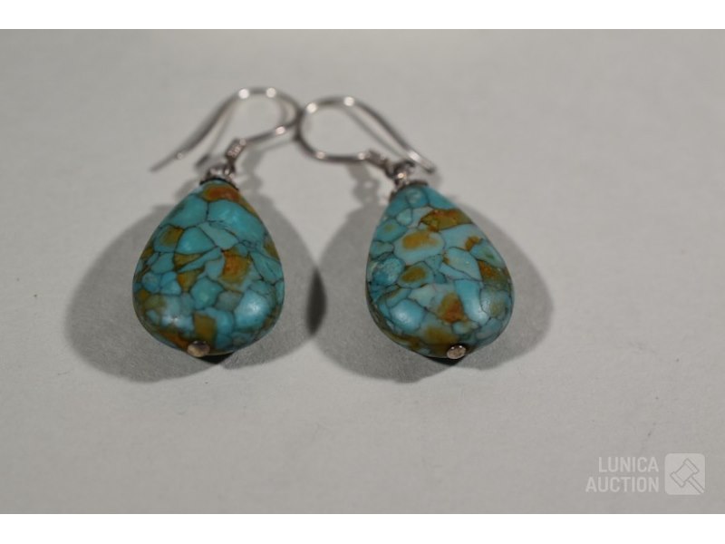 Halsketting, armband, oorhangersO.a. Gemaakt van turquoise steen, in zilveren vatting. Lengte hanger ca. 6 cm. Lengte halsketting is 60 cm. Armband is rekbaar, o.a. emaille in zilveren vatting. Sieraden zijn niet gemerkt.