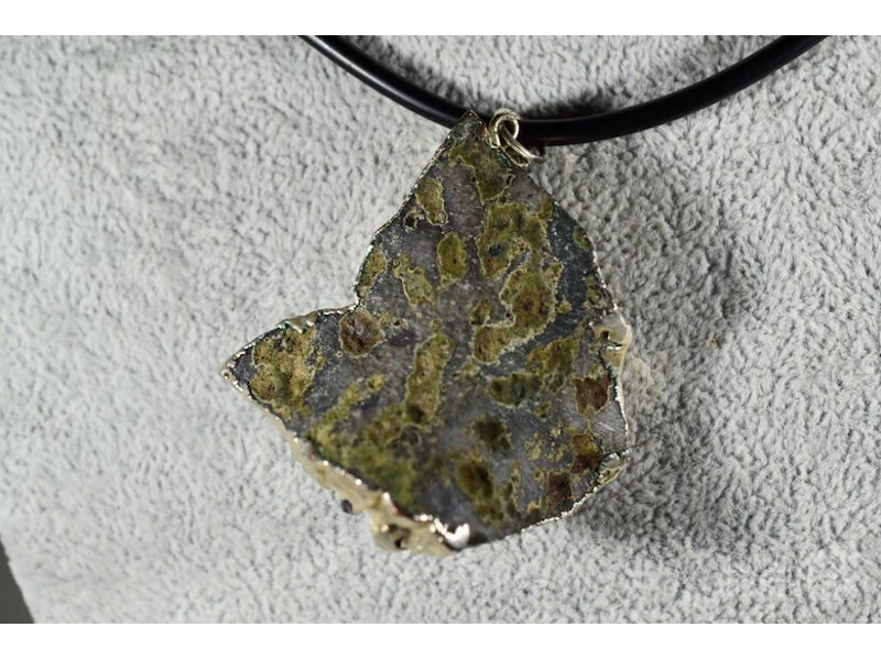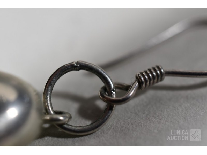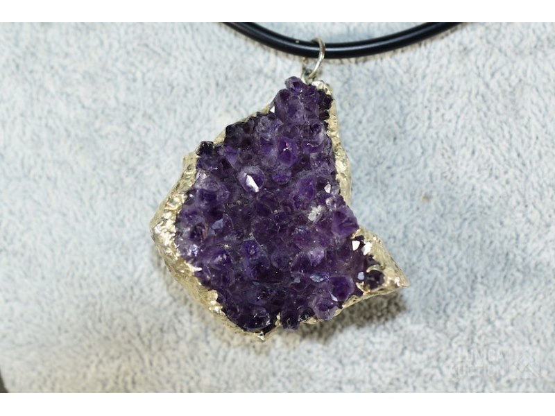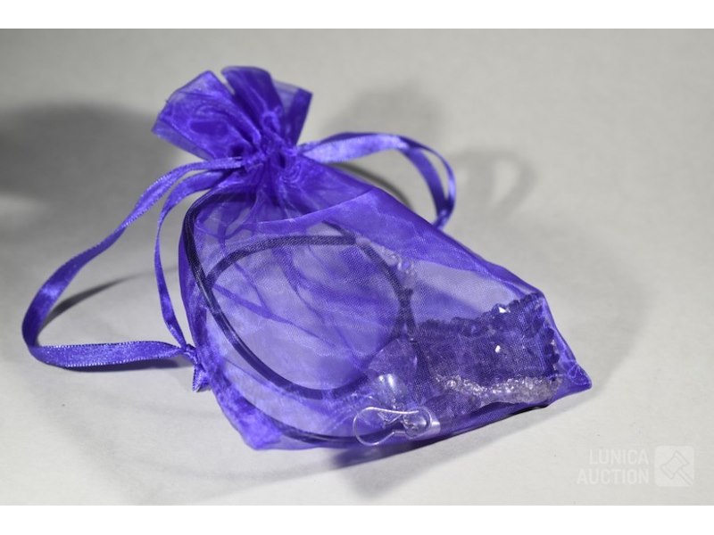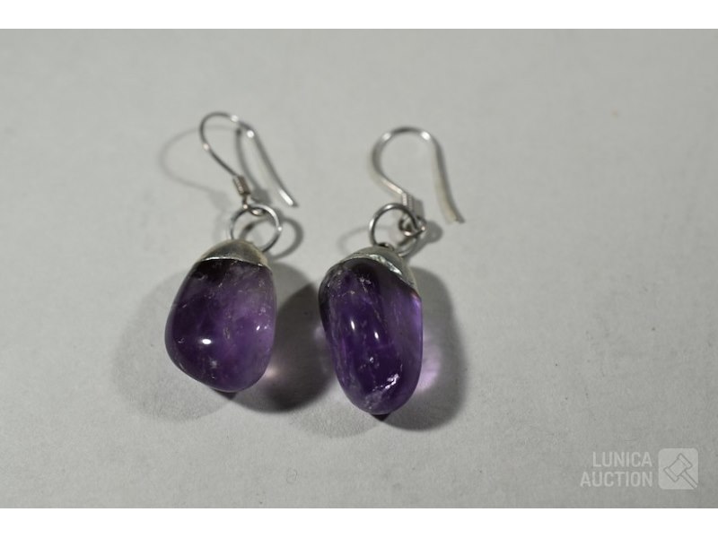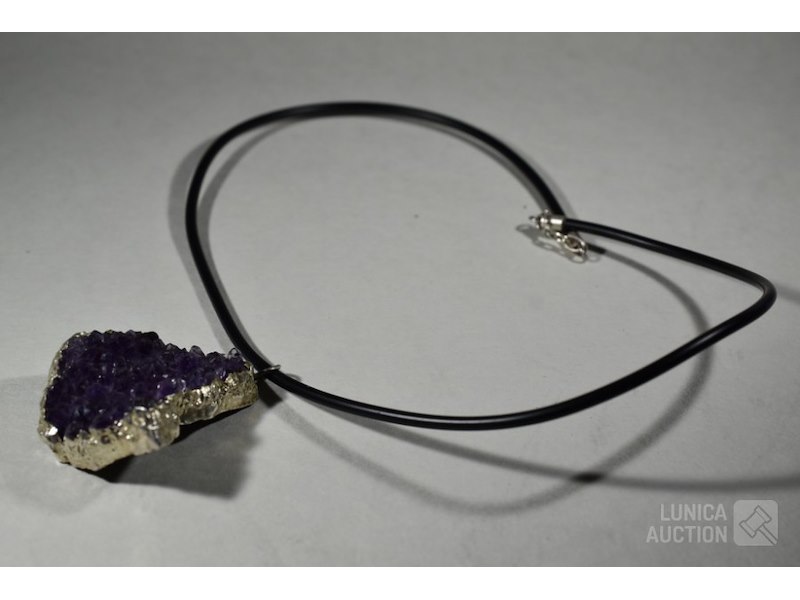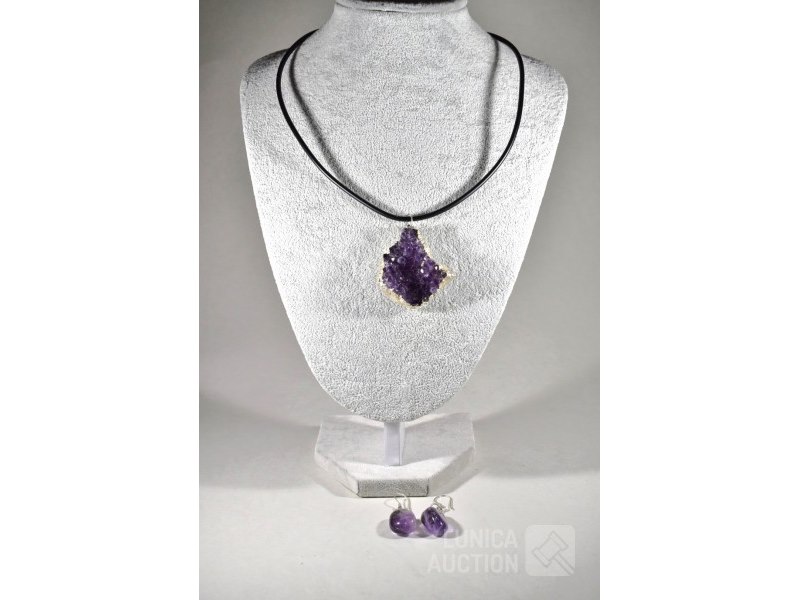 Halskoord met hanger van amethistkristalAfmeting 45x50 mm, gewicht ca. 28 gram; Oorhangers, afmeting 14x22 mm