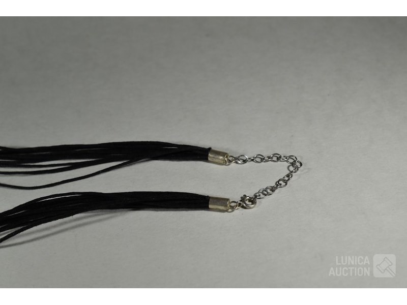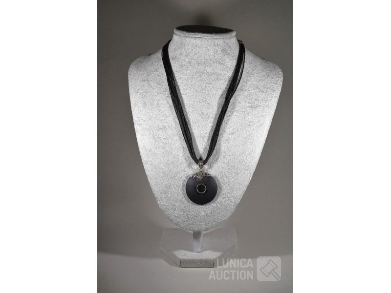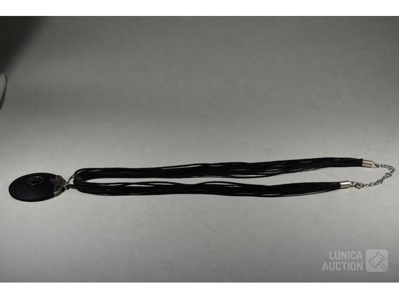Koordketting met zwarte hangerSluiting en vatting hanger in zilver 925, gemerkt met zilver 925. Lengte koord met sluiting 48 cm.