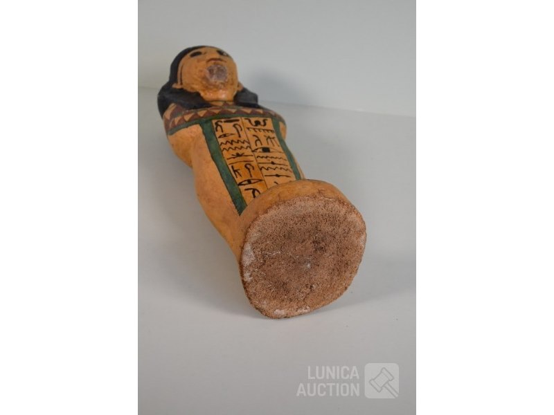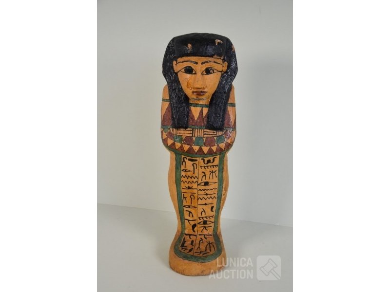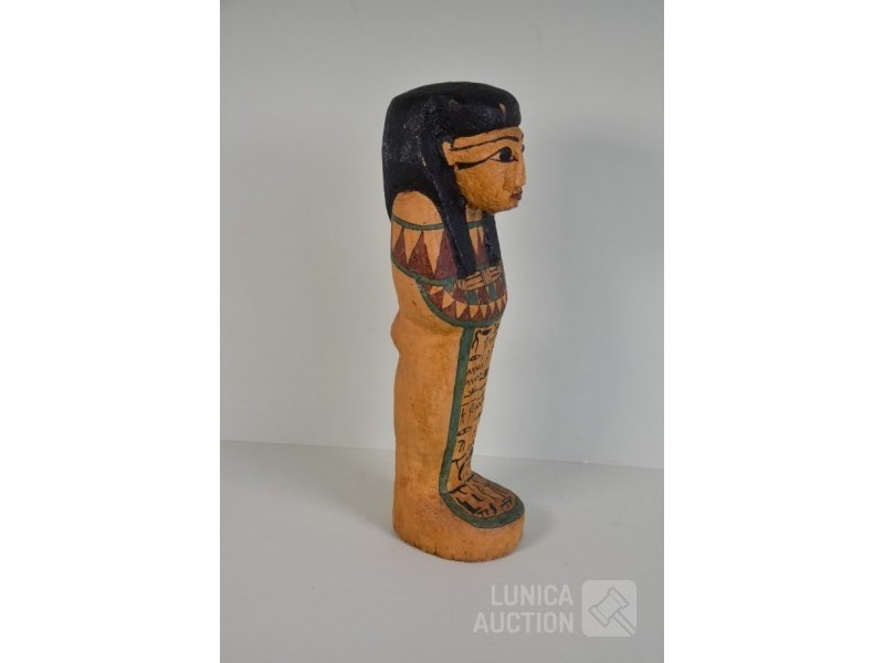 Egyptische ShabtiGepolychromeerd hout(kurk?). Diverse kleine beschadigingen. Beeld mist "valse baard" Hoogte 55 cm.