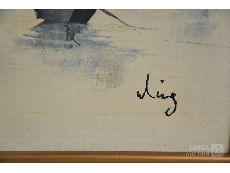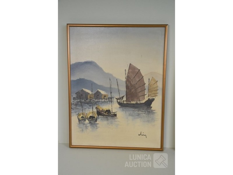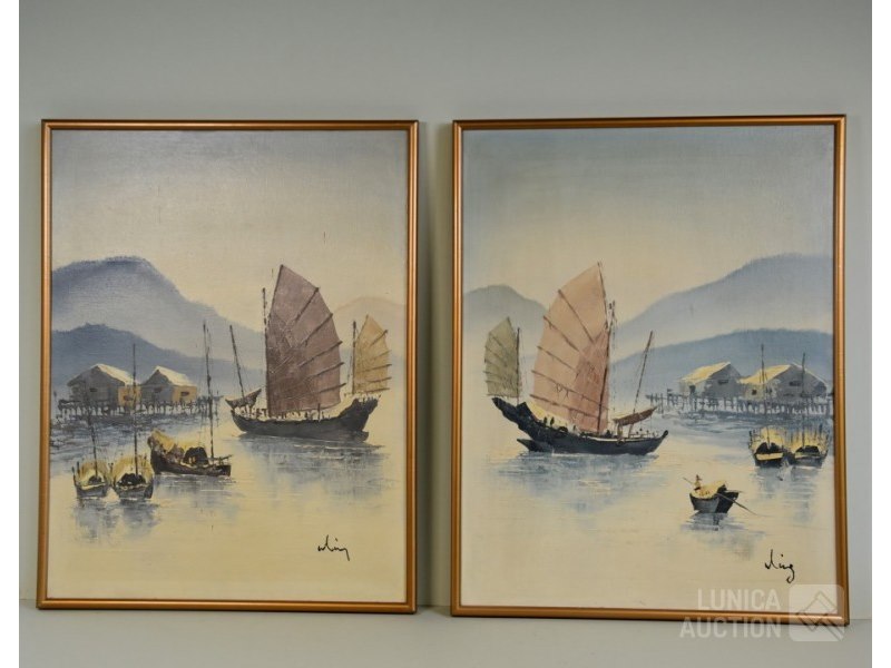 2 stuksolieverf op paneel, "Chinese jonken in haven", Gesigneerd R.O., Ingelijst. Afmeting 50x63 cm