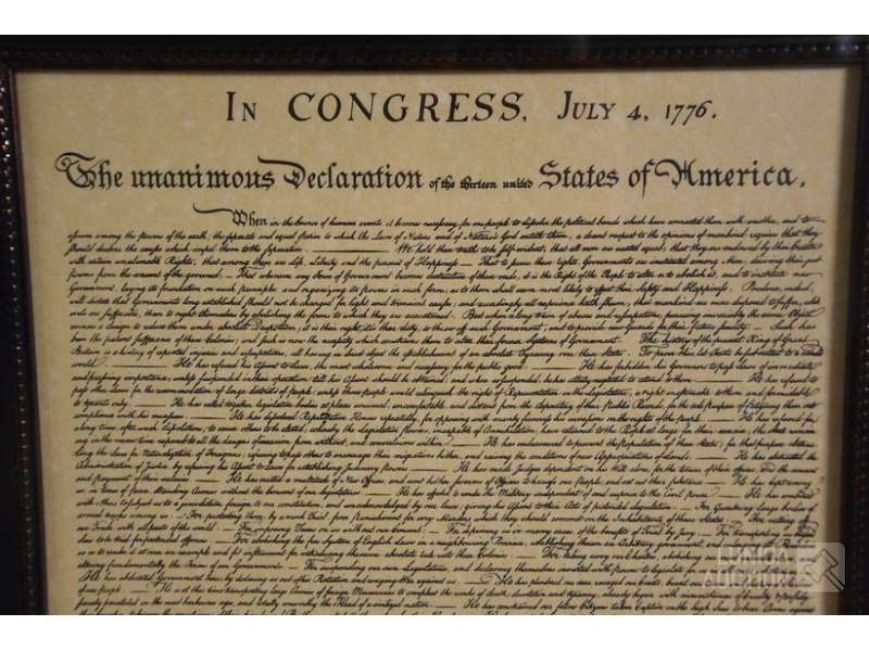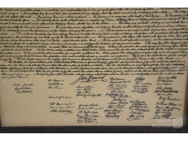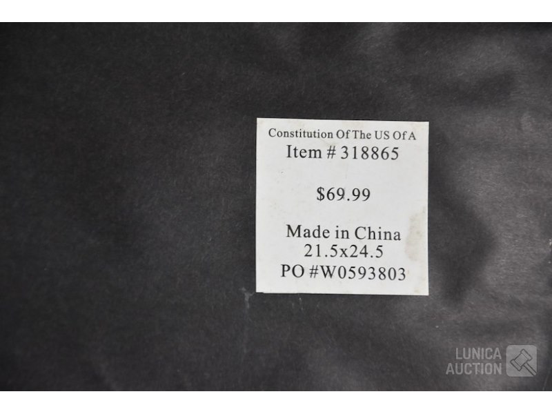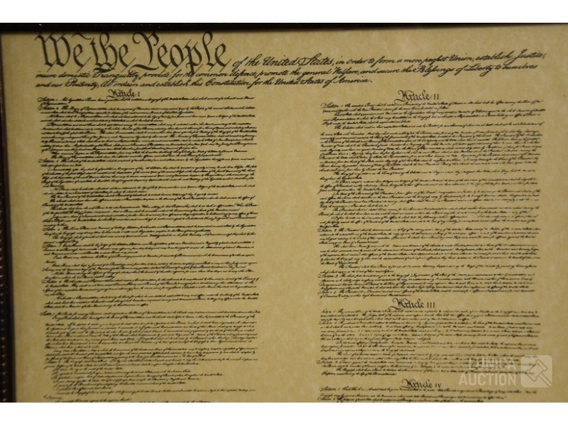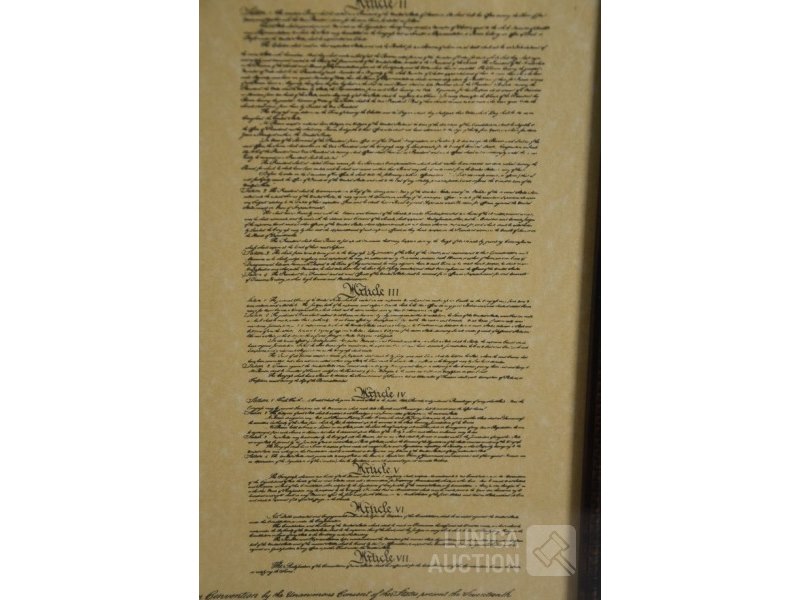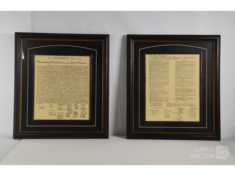 2 stuks, reproducties"Constitution of the US of A" en "Decleration of dependence". Ingelijst achter glas, afmeting 55x61 cm