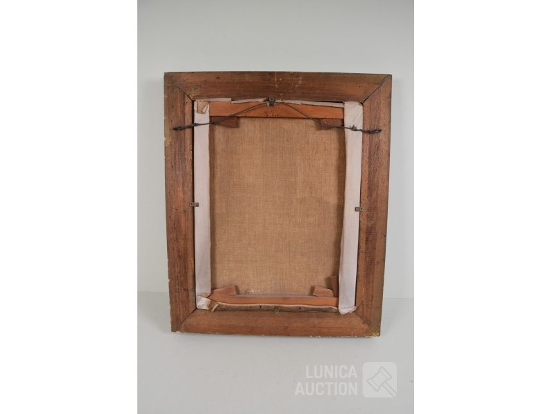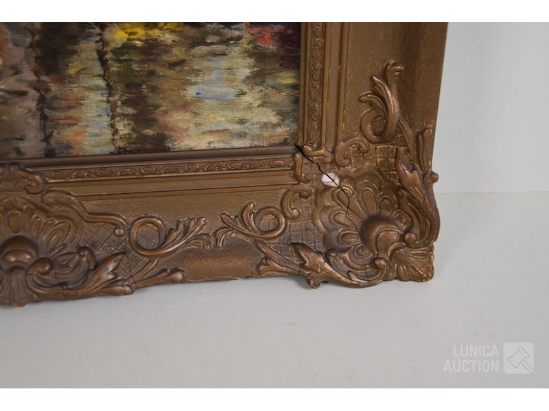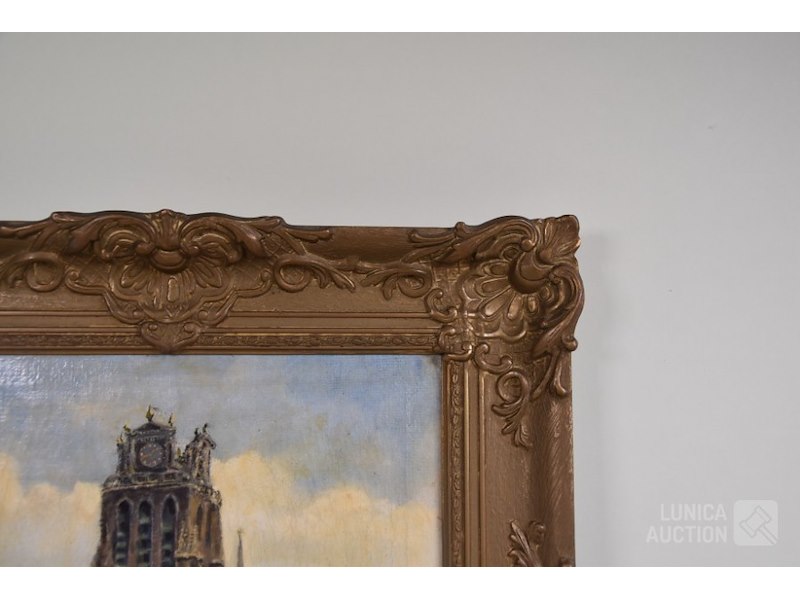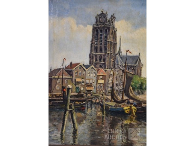 Olieverf op doek, " havengezicht Dordrecht"niet gesigneerd. Afmeting 50x60 cm. Lijst heeft lichte beschadigingen.