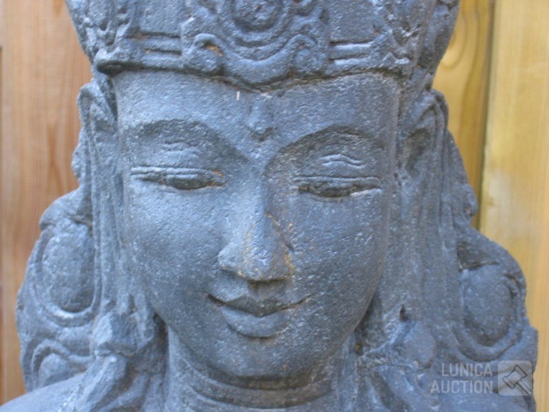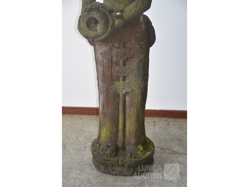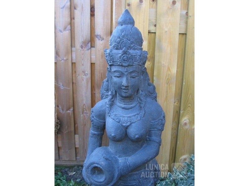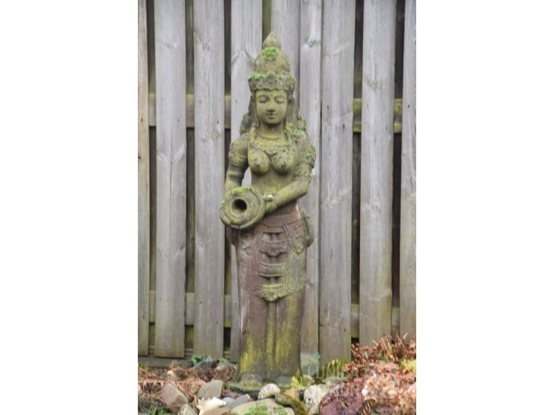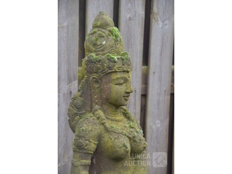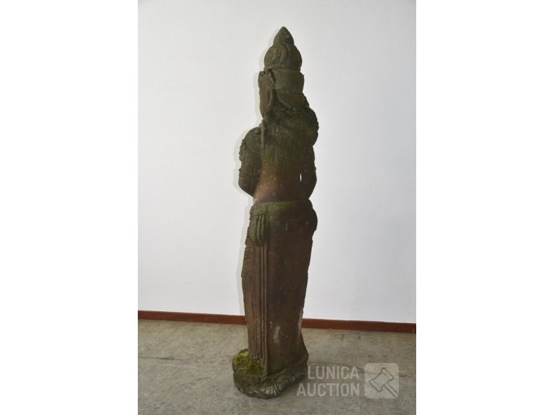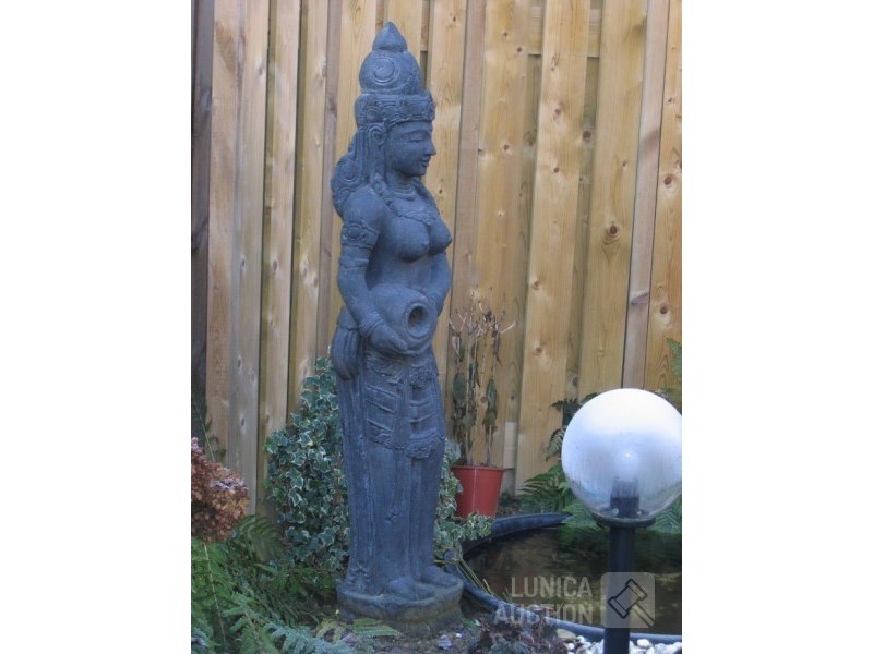 Offerbeeld van lavasteenAfmeting (bxdxh) ca. 40x30x152 cm! Gewicht meer dan 150 kg. Indonesisch. Mooi tuinbeeld met natuurlijke verkleuring door weersinvloeden. De laatste 4 foto's zijn van het moment dat het beeld in de tuin is geplaatst, 25 jaar geleden.