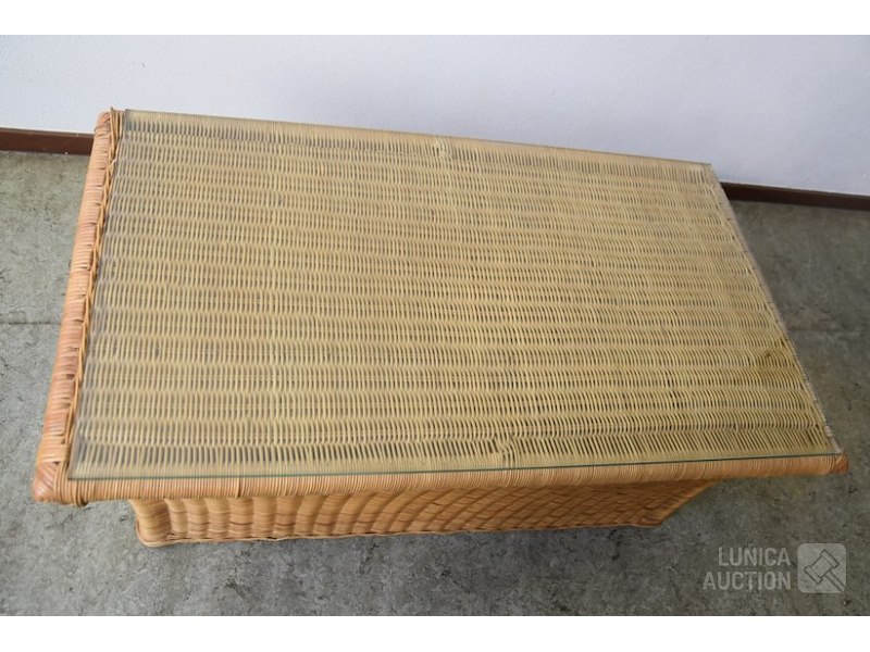 Met glasplaat als bovenbladDikte glasplaat 1 cm. Riet/rotan tafel. Afmeting (bxdxh) 107x60x47 cm. In goede staat.
