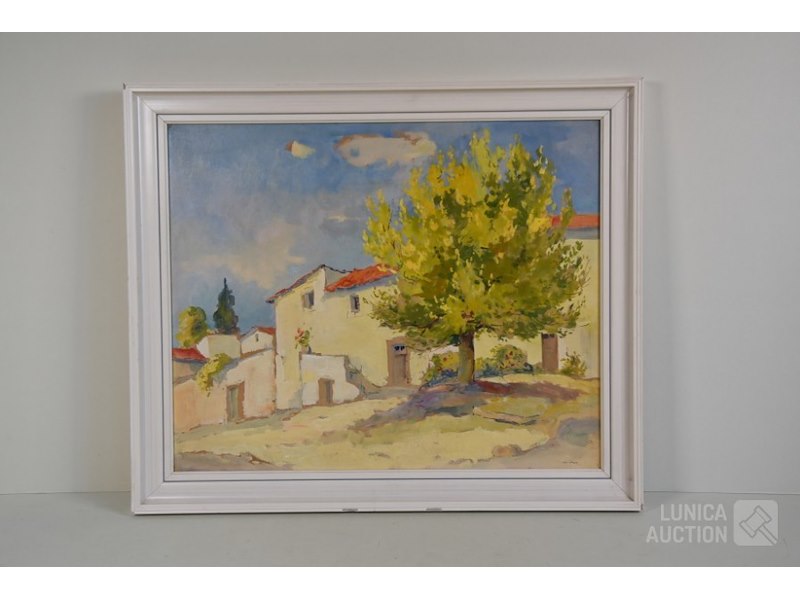 JAN KAGIE (1907-1991)"huis in zuid-frankrijk", olieverf op schildersboard, gesigneerd R.O., ingelijst. Afmeting 65x55 cm.
