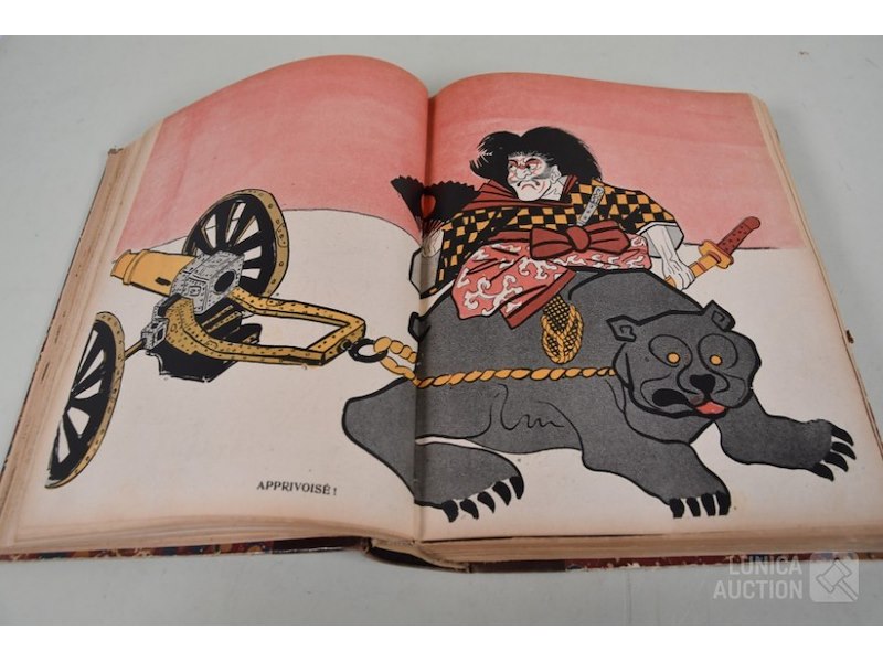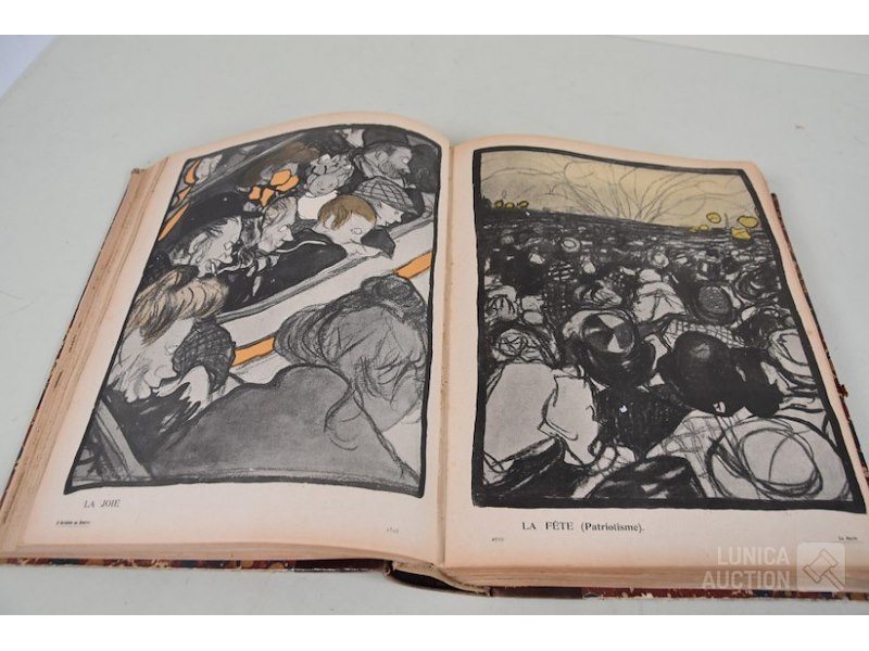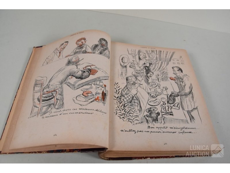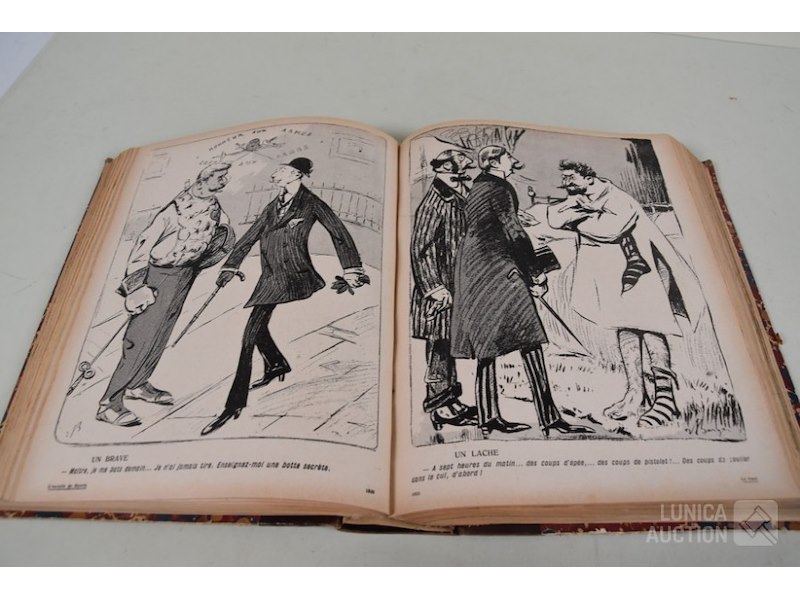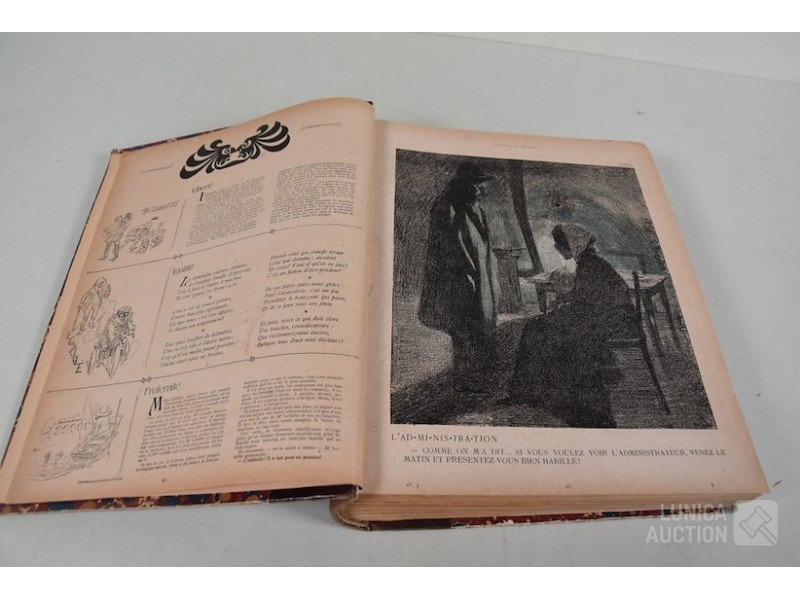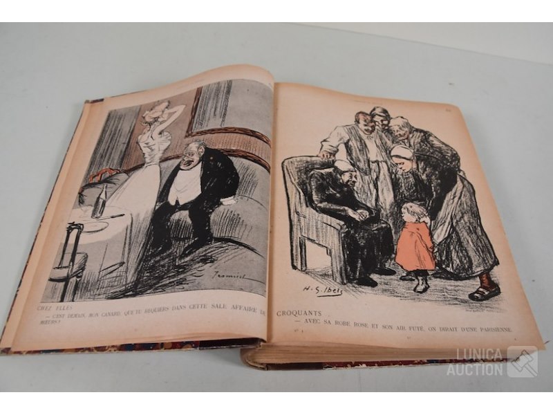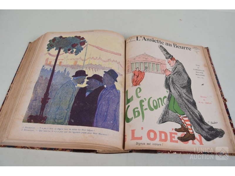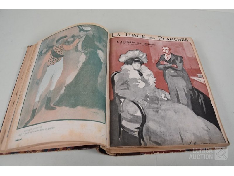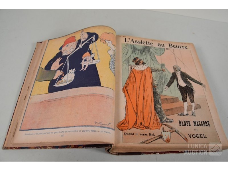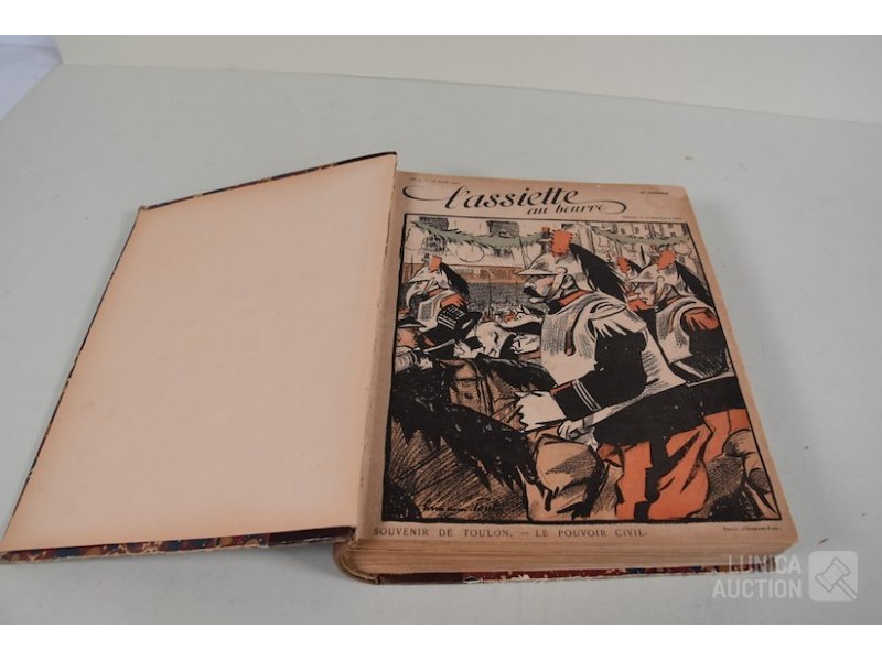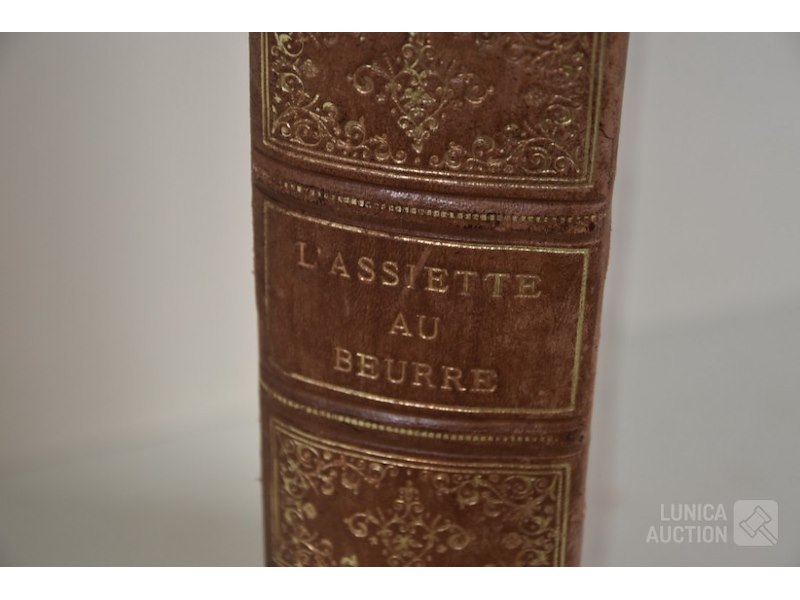 "L'ASSIETTE au BEURRE", 1900-1911franstalig. Veel complete nummers (ca. 50 stuks) met spotprenten (kleur en zwart/wit) uit deze periode ingebonden in lederen omslag. Voor de echte verzamelaar. Afmeting 26x33 cm. Gezien de leeftijd in goede staat.