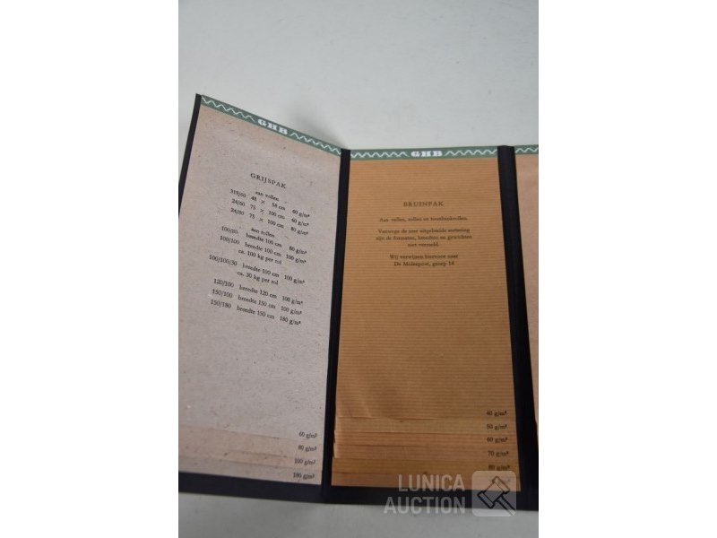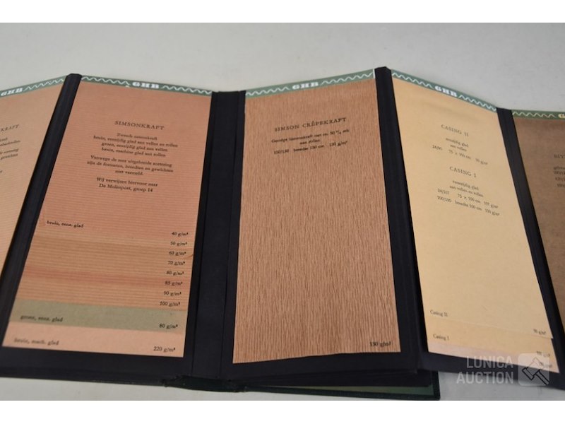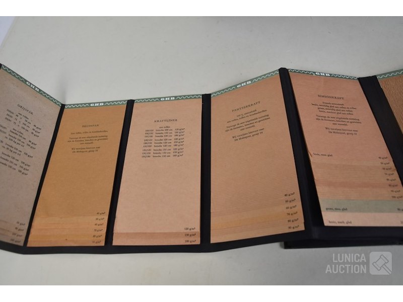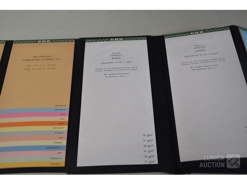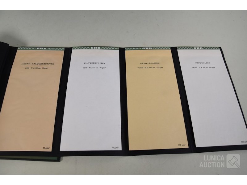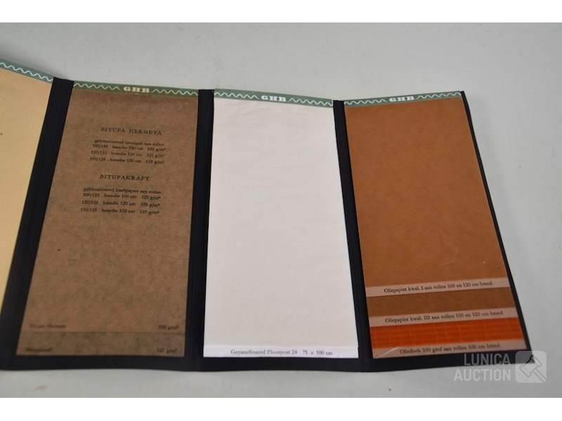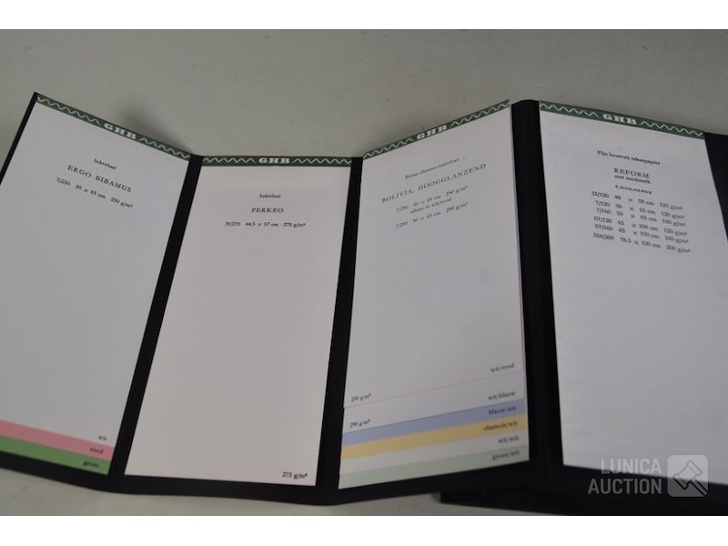 12 stuks/boeken, papiermonsters GHB papierHet betreft hier allemaal voorbeelden van papiersoorten die voor de verkoop zijn gebruikt. In rek.