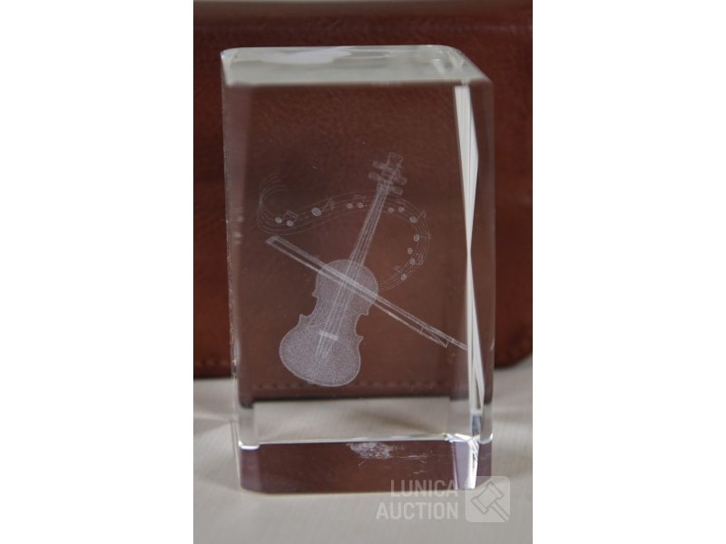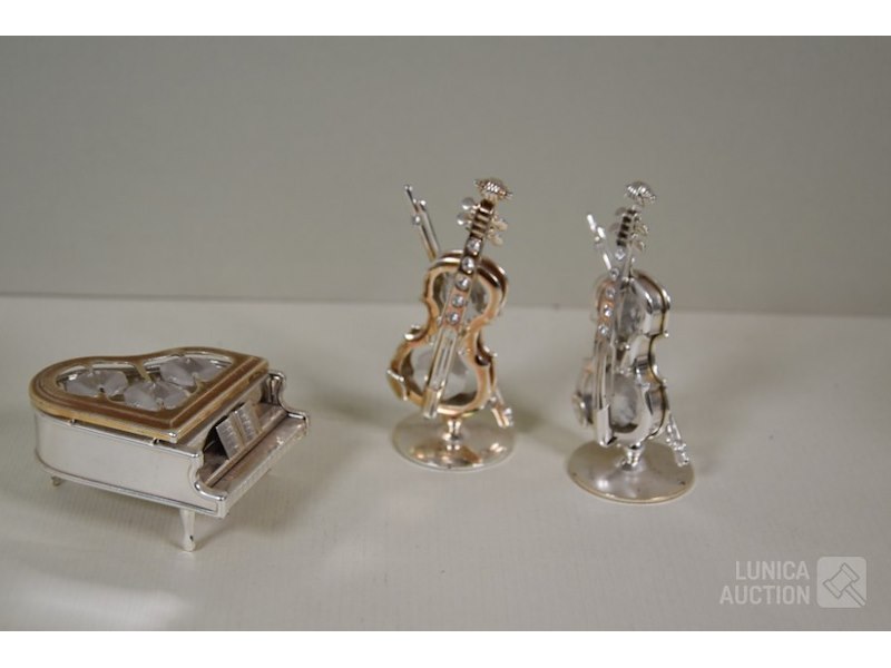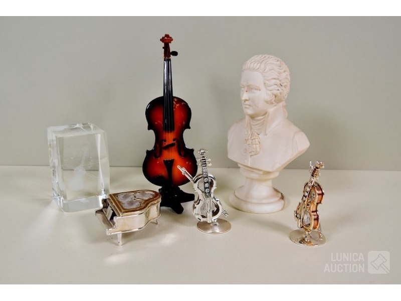 Ca. 6 stuksO.a. 2x viool, piano met inzet van kristal glas; hoogte 5 cm en 8 cm; Buste van "mozart", in natuursteen, hoogte 15 cm.; "cello", hoogte 17 cm.; Glaskunst, hoogte 8 cm. met in binnenzijde een gegraveerde viool.