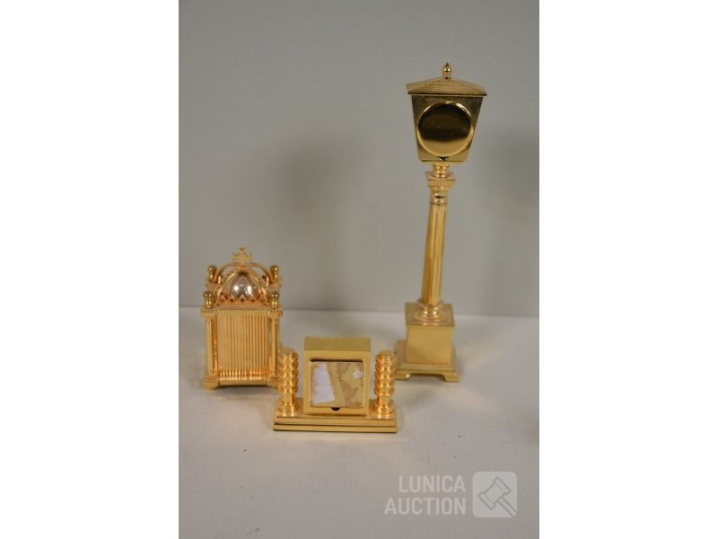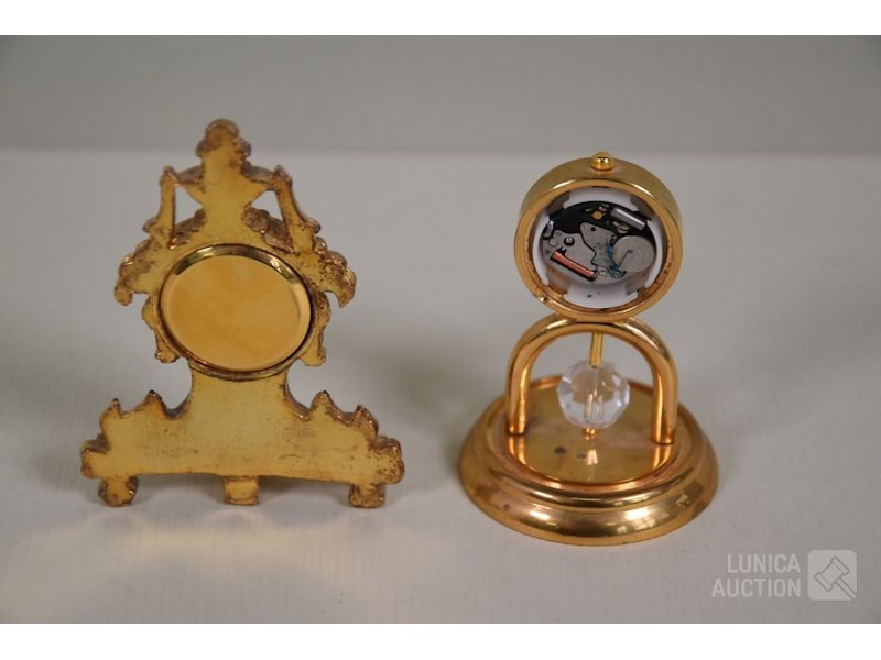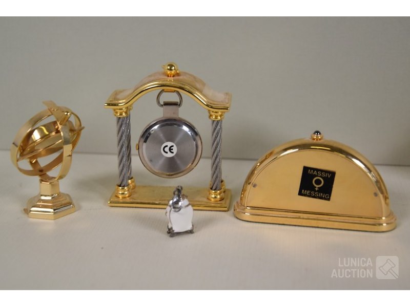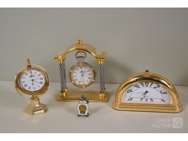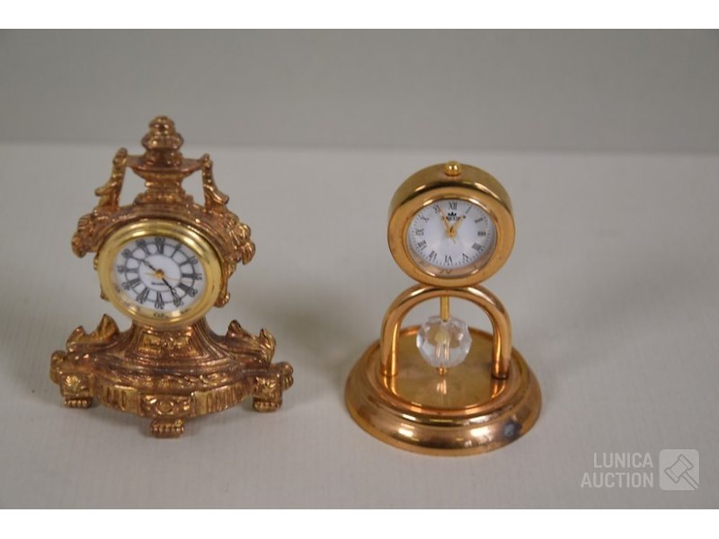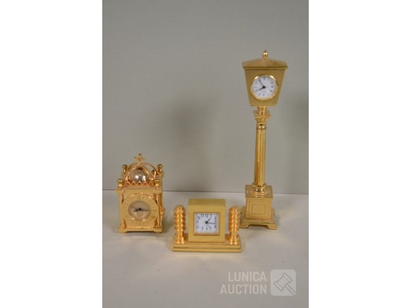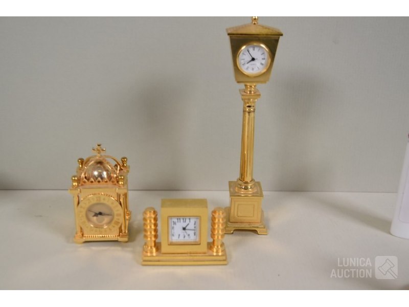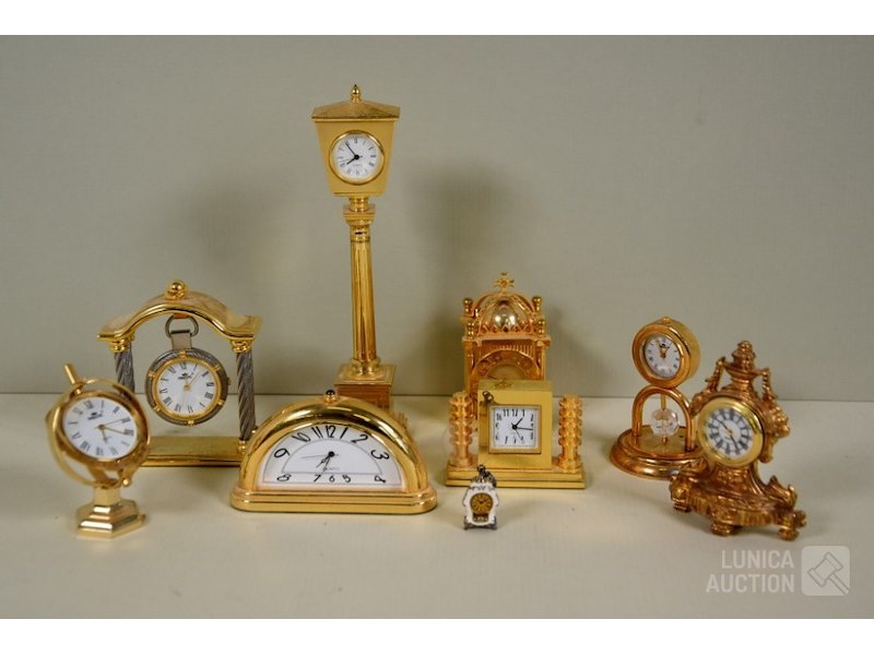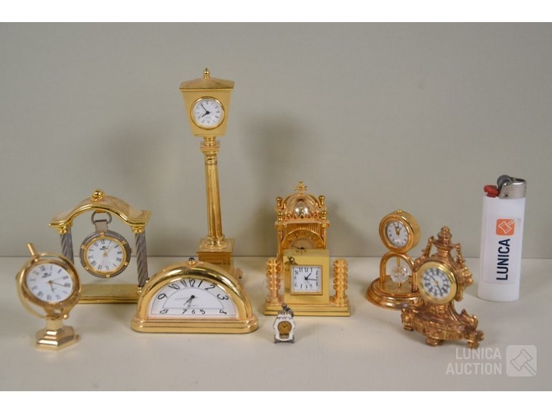 Ca. 8 stuksO.a. messing klokjes met quartz uurwerkjes, diverse modellen, o.a. zonnewijzer, lantaarnpaal, barokke klok enz; Merken: o.a. MAJESTIC. Hoogte variërend van 4 cm tot 14 cm. Klokjes staan stil, niet getest. Van één klokje ontbreekt beschermkapje batterij.