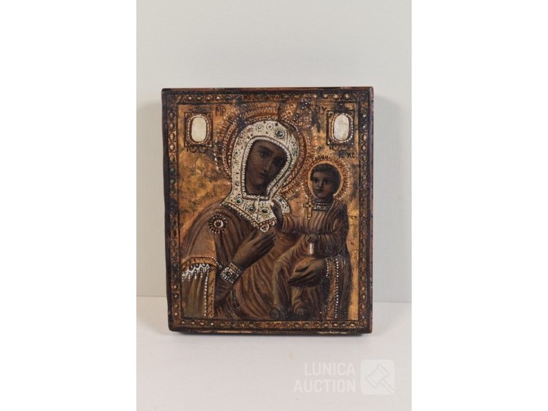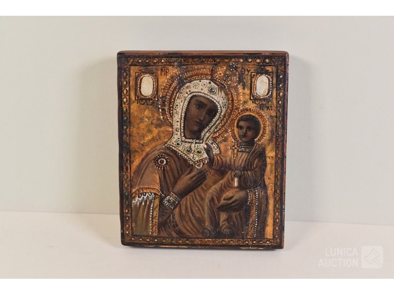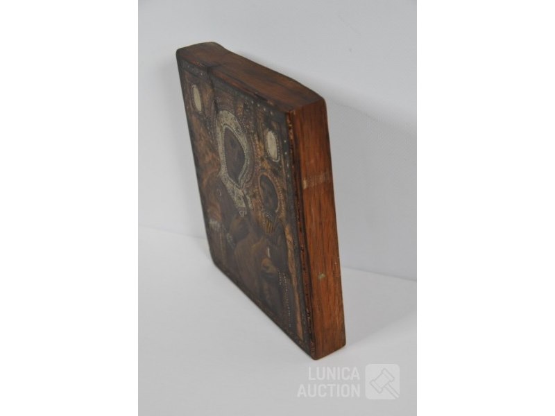 Handbeschilderd hout, gesigneerdOp achterzijde staat vermeld "2 mai 1957, Jérusalem, Vieux de +/- 250 ans" Gesigneerd met monogram MP. Beschildering op antiek hout. Afmeting (bxhxd) 15x18x3 cm.