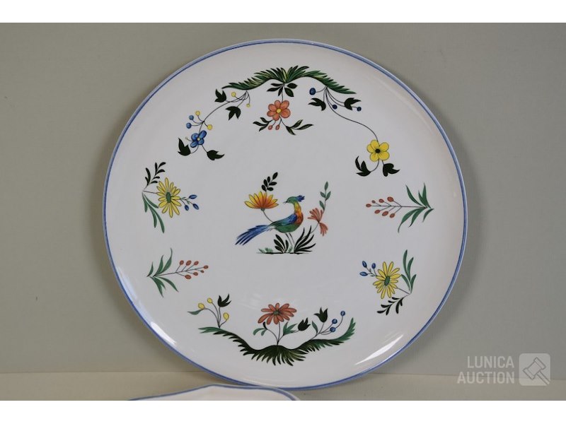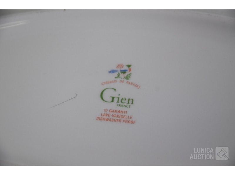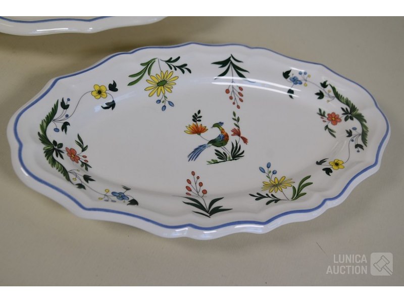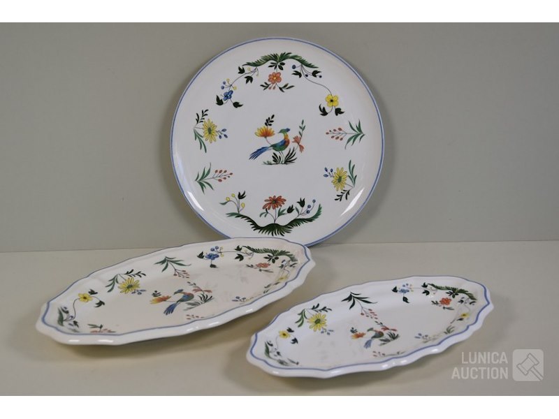 3 stuks, GIEN servies3 schalen, serie "Oiseaux de paradis, decor Grand feu", afmeting 40x26 cm, 36x20 cm, schaal Ø 32 cm