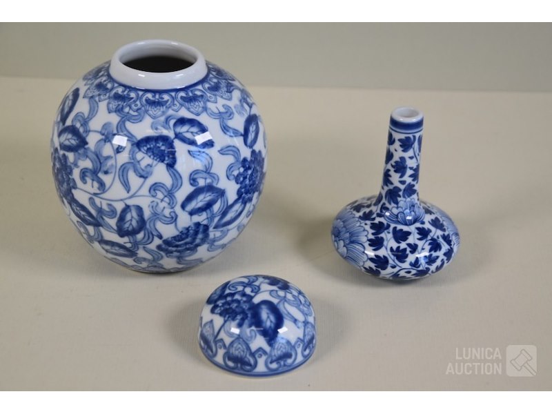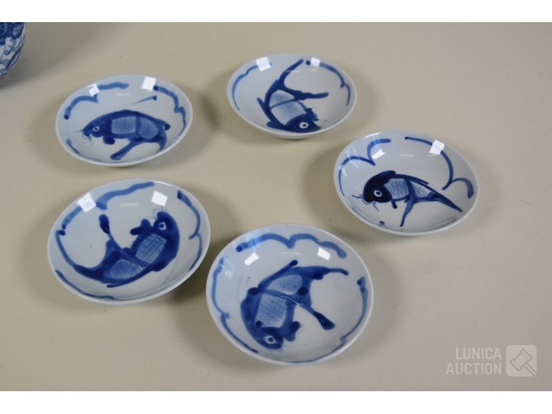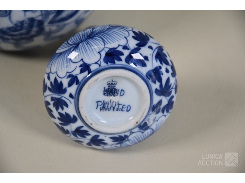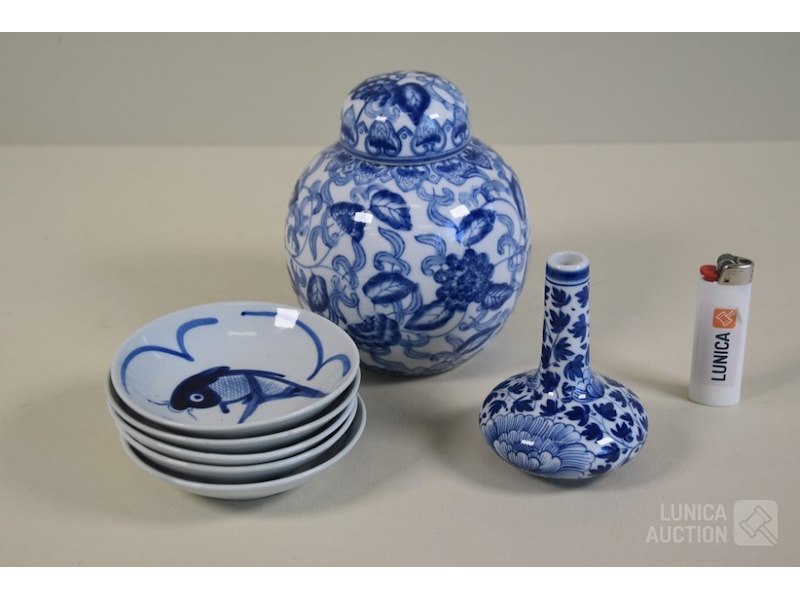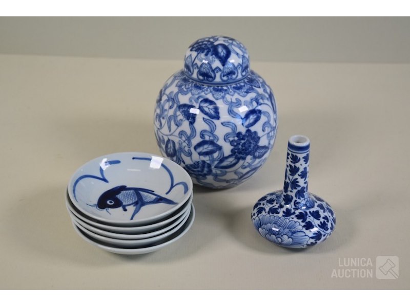 Ca. 7 stuksO.a. Handbeschilderd vaasje, afkomstig van Museumshop Paleis het Loo; Gemberpot, afkomstig van RIGEAUX Visé, hoogte 15 cm; schaaltjes, doorsnede 10 cm met decoratie van vissen.