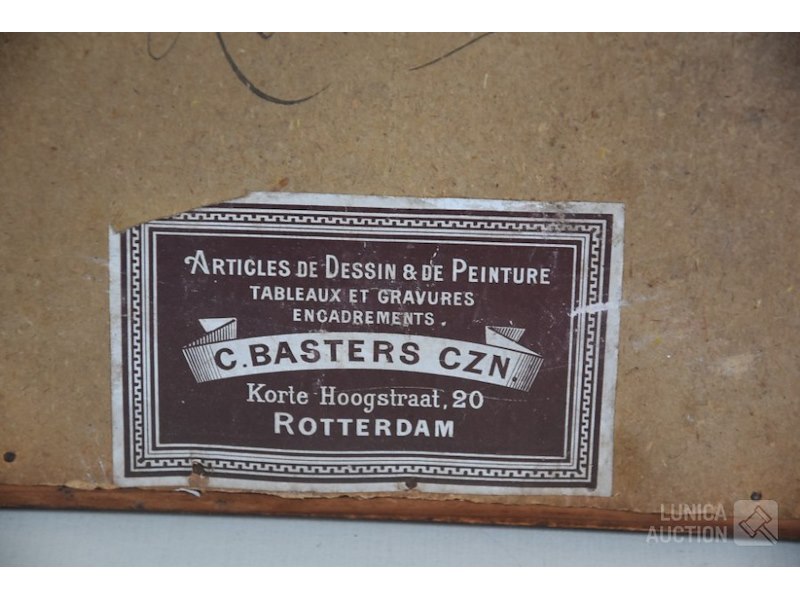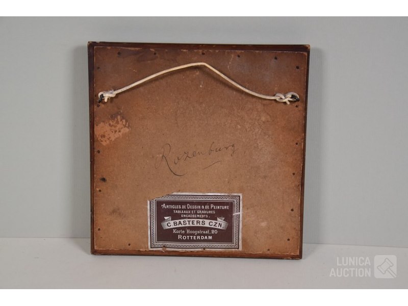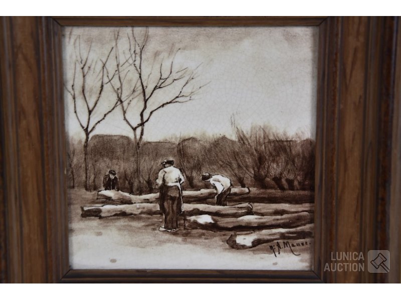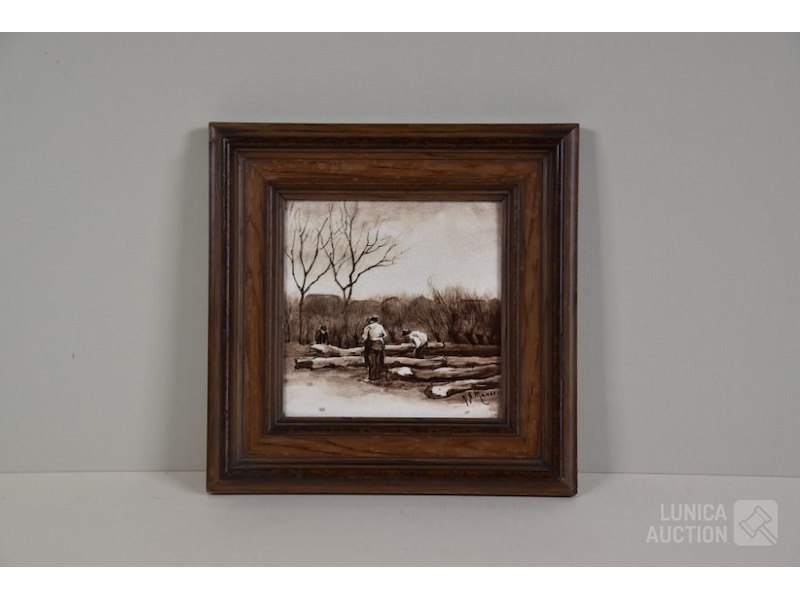 Voorstelling van Anton Mauve (1838-1888)De keramische tegel is toegeschreven aan Rozenburg Den Haag en ingelijst door C Basters, Korte hoogstraat 20 Rotterdam (1893-1895) Afmeting 24x24 cm.