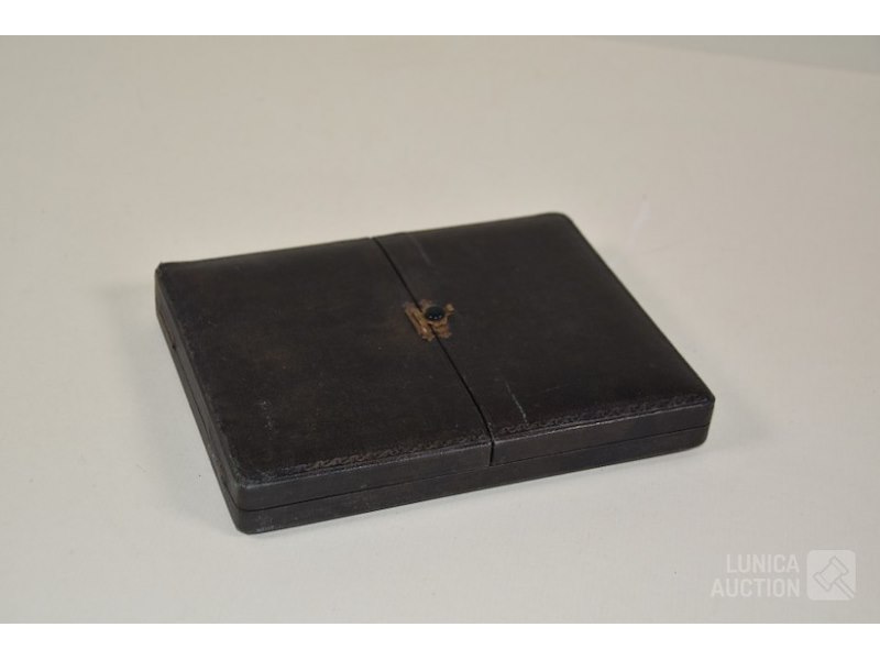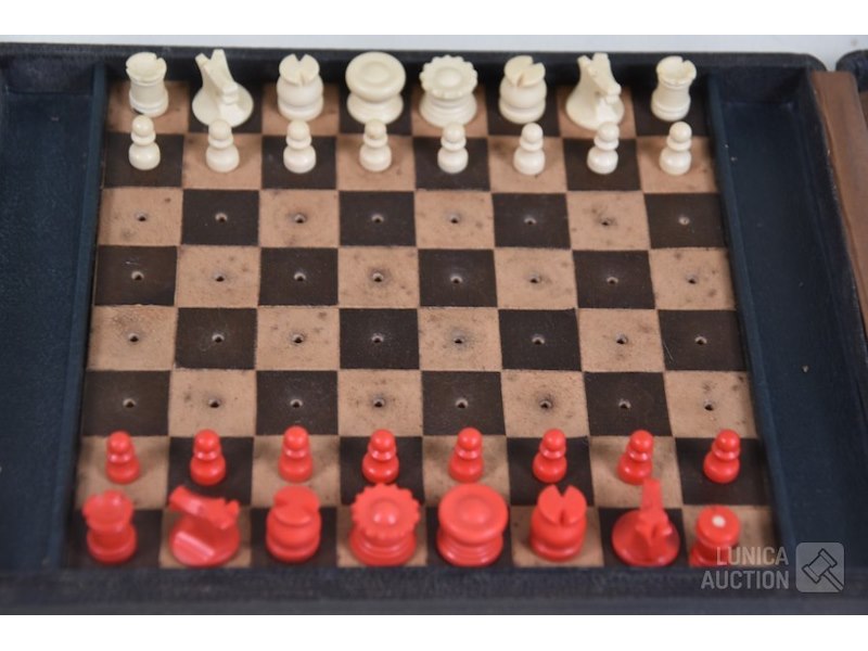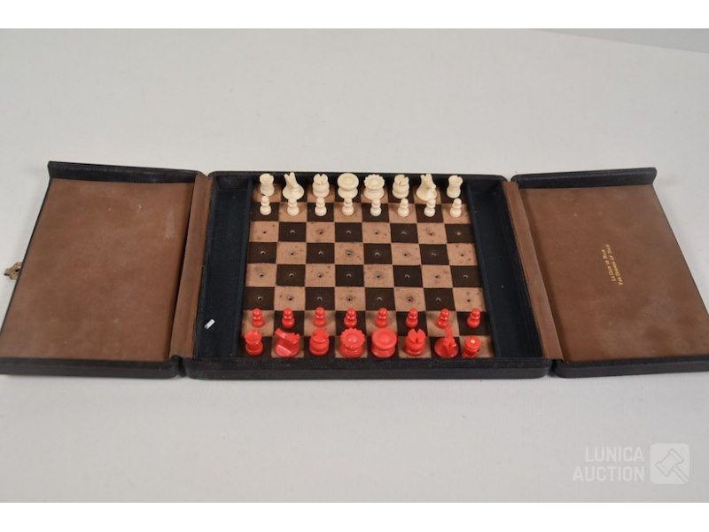 Mini schaakbord in cassetteVoor op reis, afmeting cassete 22x17 cm. In cassette staat tekst "Le coin de Nice, The corner of Nice". Voorzien van sierslot.