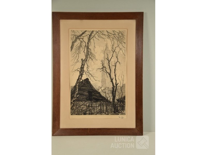 "De OLV toren Amersfoort"Ets, ingelijst, achter glas. Gesigneerd R.O.. Afmeting 50x68 cm