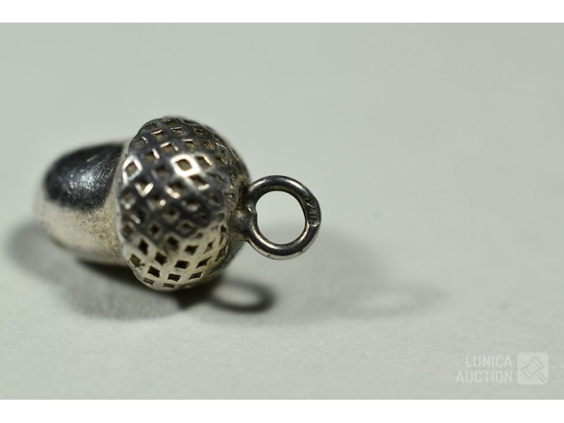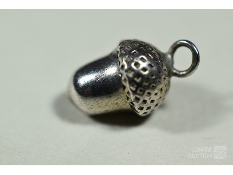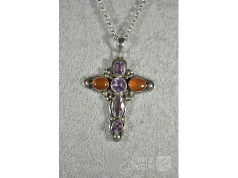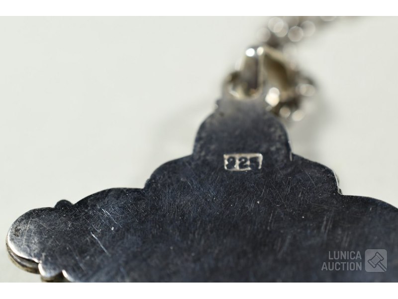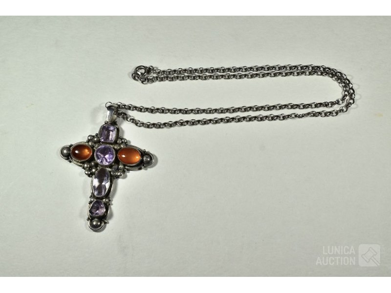 Hanger, zilver 925Met inzet van amethist en barnsteen. Gemerkt met 925, afmeting 40x50 mm; Halsketting, gemerkt met 925. Inclusief kleine hanger, in de vorm van een "eikel", hoogte 18 mm, gemerkt met "ZII", 2e gehalte zilver.