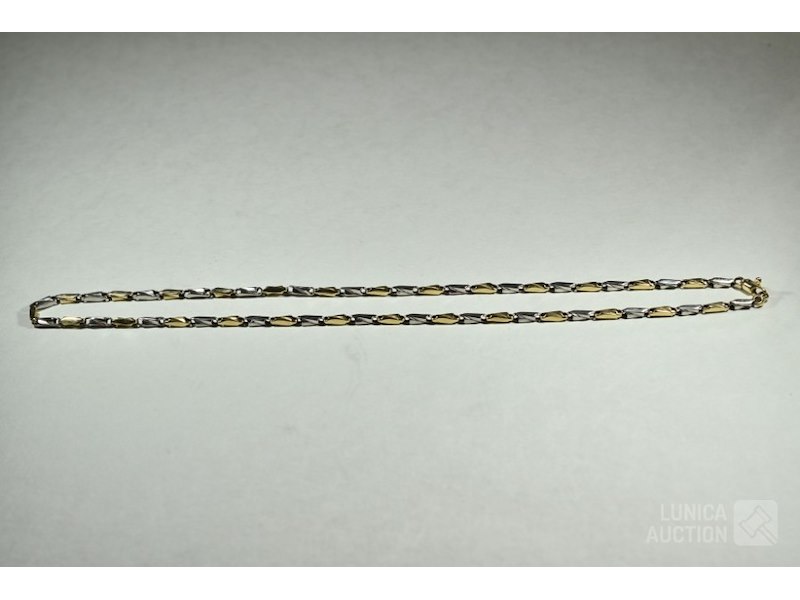 Met schakels van witgoud en geelgoudGemerkt in slotje met 585, Lengte 46 cm. Gewicht ca. 9,9 gram.