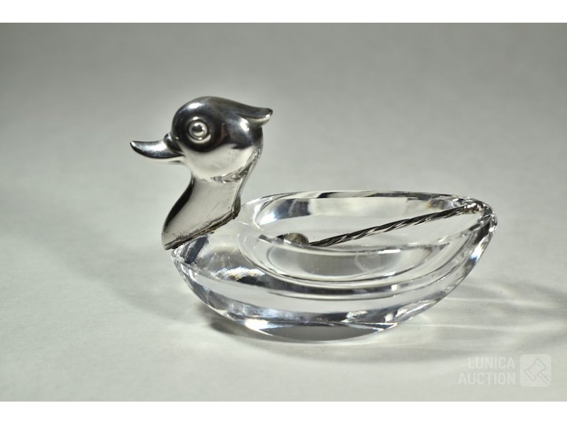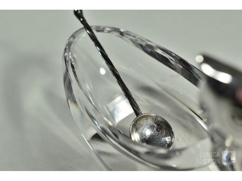 In de vorm van zwaan, met lepel.Hoofd zwaan gemerkt met 835/ZII en HB (Herman Bauer). Open zoutvaatje van kristalglas. Afmeting (bxh) 70x50 mm. Zilveren lepeltje, lengte 50 mm