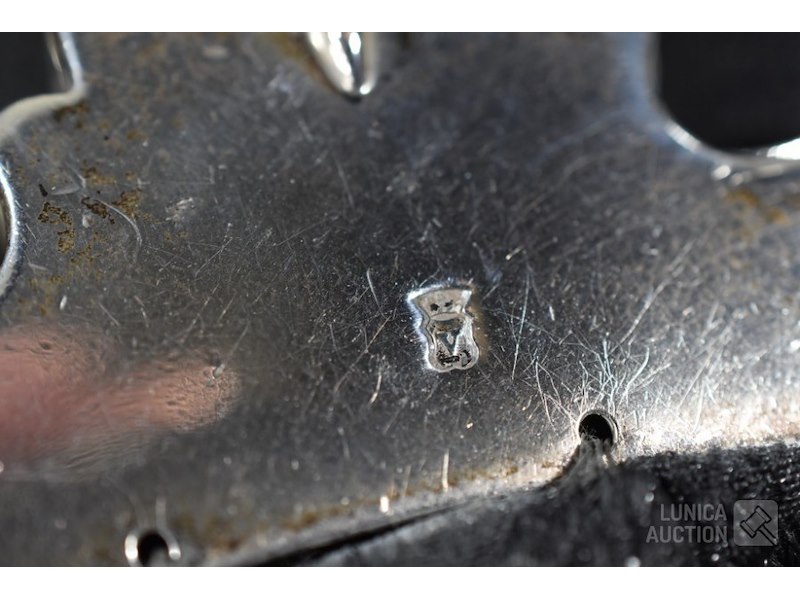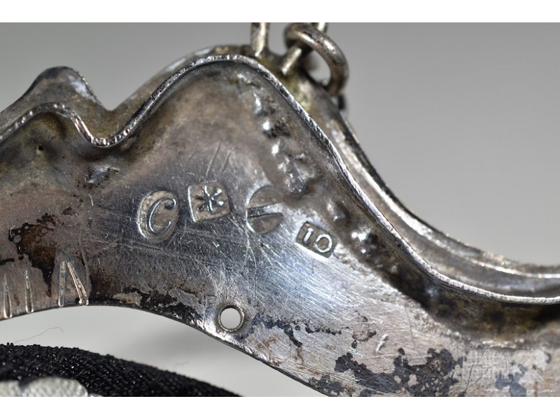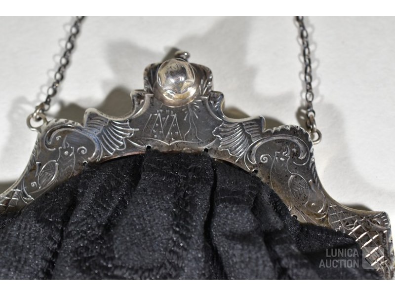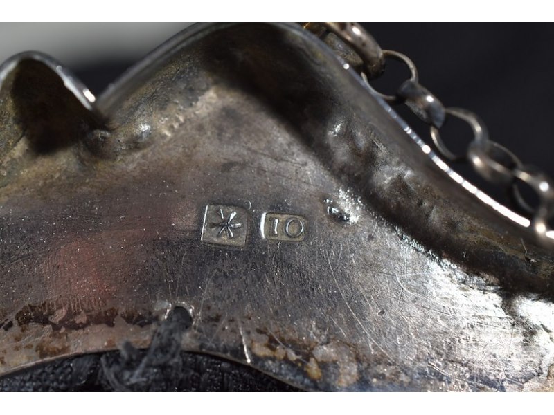 Met zilveren beugel en haakEnkele beugel, 19e eeuws. Gemerkt met o.a. jaarletter C (1810), gehalte teken en 6 puntige ster van Gijsbert Capoen Schoonhoven. Afmeting 20x24 cm