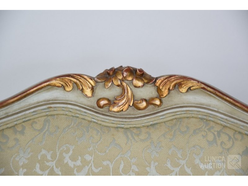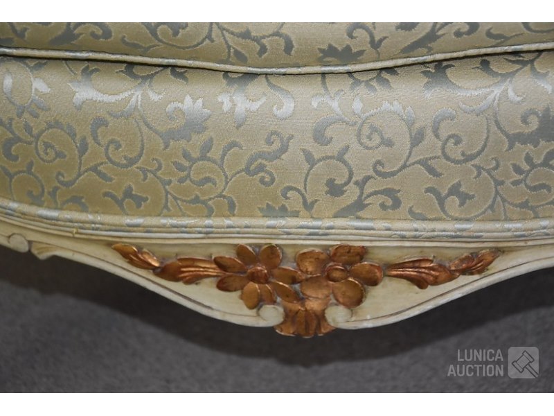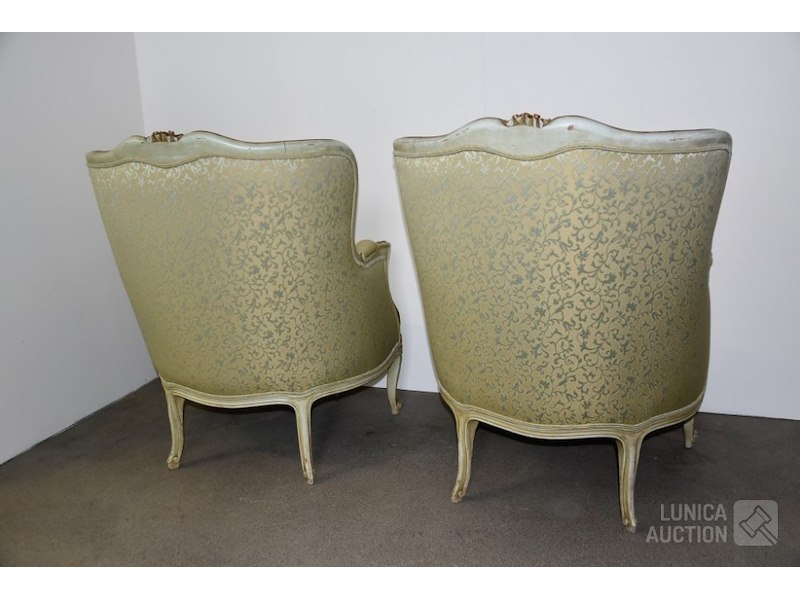 2 stuks, "Lodewijk XV"stijlGepolychromeerd beukenhout met goudkleurige accenten. Fauteuils zijn gebruikt maar in goede staat. Mooie bekleding. Afmeting (bxdxh) 70x73x90 cm