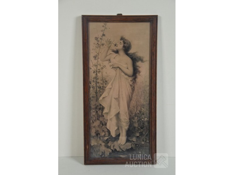 4 stuks, "romantische stijl"Ingelijst, achter glas, o.a. 2x "roos", druk PJ Redoute, " afmeting 30x35 cm; "vrouw met kruik", J.W. Godward afmeting 23x30 cm.; "vrouw tussen bloemen", E Lappiere, afmeting 20x38 cm.