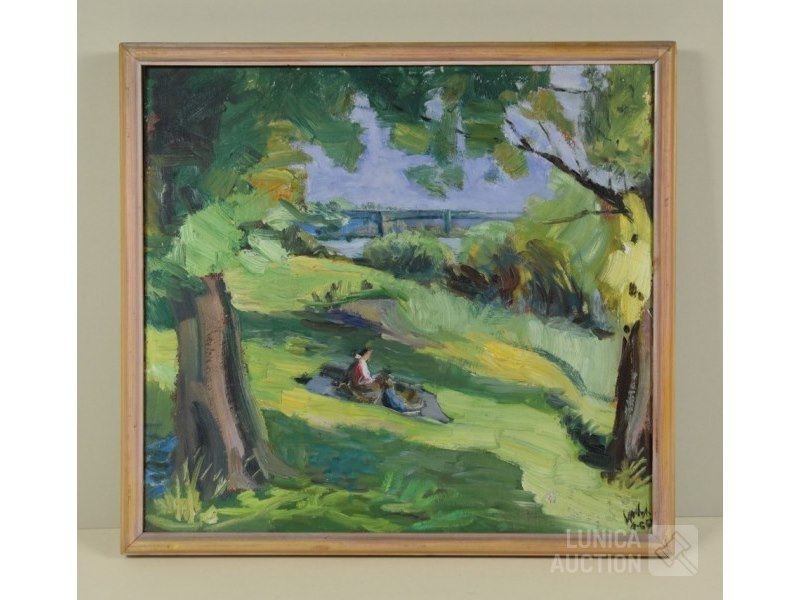"aan het water", 1952Olieverf op paneel, ingelijst, afmeting 53x50 cm. Gesigneerd R.O.