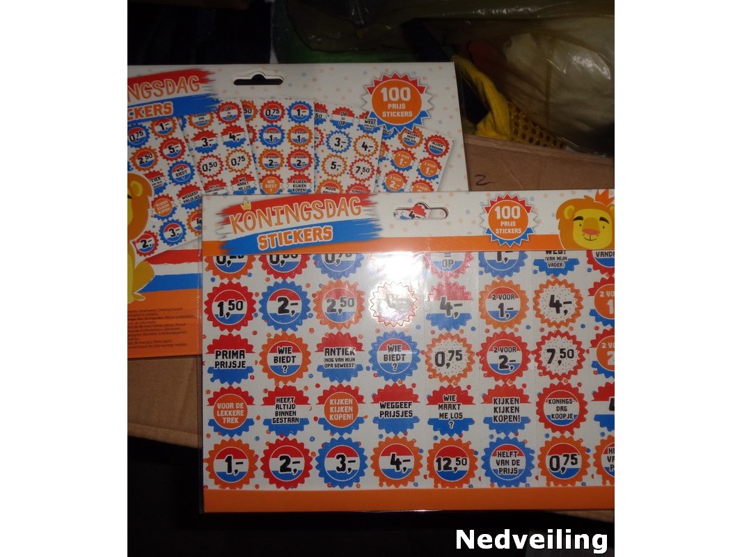 288 pakjes met 100 Koningsdag stickers, Staat: Nieuw Verzendgewicht: 10.00 Kg.