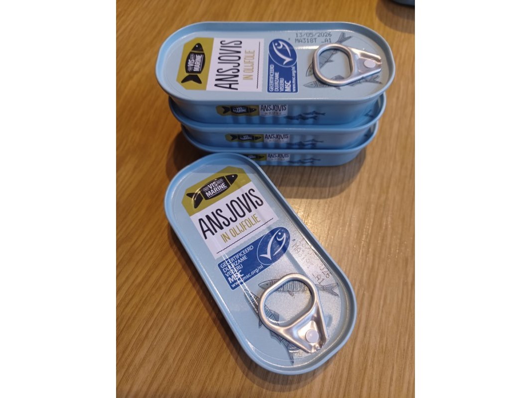 Ansjovis in olijfolie tht13-5-2026 46 gram aantal 4 blikjes.